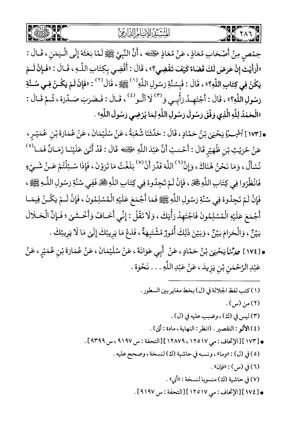 173- أَخبَرَنا يَحْيَى بْنُ حَمَّادٍ, قَالَ: حَدَّثَنَا شُعْبَةُ, عَنْ سُلَيْمَانَ, عَنْ عُمَارَةَ بْنِ عُمَيْرٍ, عَنْ حُرَيْثِ بْنِ ظُهَيْرٍ, قَالَ: أَحْسَبُ أَنَّ عَبْدَ اللهِ رَضِيَ اللهُ عَنْهُ, قَالَ: قَدْ أَتَى عَلَيْنَا زَمَانٌ فَمَا (1) نُسْأَلُ, وَمَا نَحْنُ هُنَاكَ, وَإِنَّ اللهَ قَدَّرَ أَنْ بَلَغْتُ مَا تَرَوْنَ, فَإِذَا سُئِلْتُمْ عَنْ شَيْءٍ, فَانْظُرُوا فِي كِتَابِ اللهِ عَزَّ وَجَلَّ, فَإِنْ لَمْ تَجِدُوهُ فِي كِتَابِ اللهِ عَزَّ وَجَلَّ, فَفِي سُنَّةِ رَسُولِ اللهِ صَلى الله عَليهِ وسَلم, فَإِنْ لَمْ تَجِدُوهُ فِي سُنَّةِ رَسُولِ اللهِ صَلى الله عَليهِ وسَلم, فَمَا أَجْمَعَ عَلَيْهِ الْمُسْلِمُونَ, فَإِنْ لَمْ يَكُنْ فِيمَا أَجْمَعَ عَلَيْهِ الْمُسْلِمُونَ, فَاجْتَهِدْ رَأْيَكَ, وَلاَ تَقُلْ: إِنِّي أَخَافُ وَأَخْشَى, فَإِنَّ الْحَلاَلَ بَيِّنٌ, وَالْحَرَامَ بَيِّنٌ, وَبَيْنَ ذَلِكَ أُمُورٌ مُشْتَبِهَةٌ, فَدَعْ مَا يَرِيبُكَ إِلَى مَا لاَ يَرِيبُكَ.