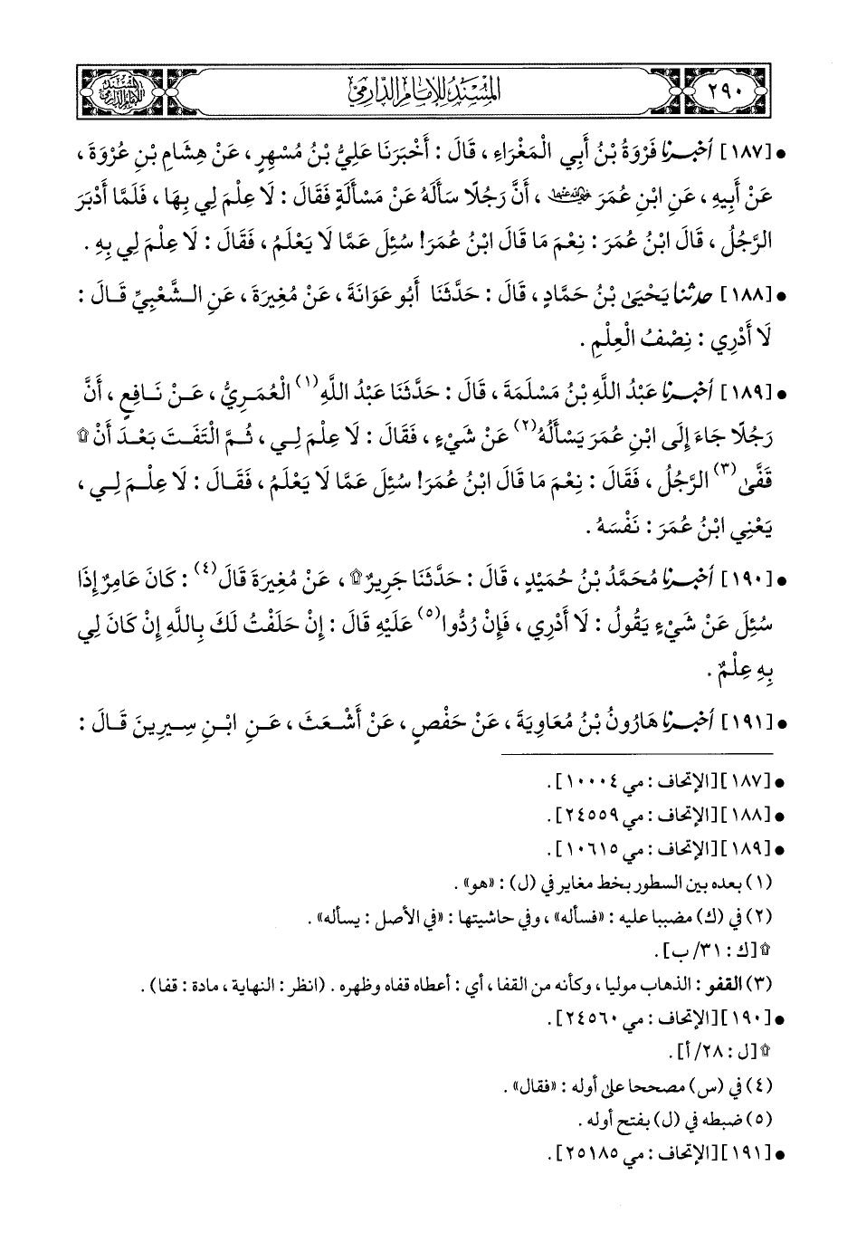 187- أَخبَرَنا فَرْوَةُ بْنُ أَبِي الْمَغْرَاءِ, قَالَ: أَخبَرَنا عَلِيُّ بْنُ مُسْهِرٍ, عَنْ هِشَامِ بْنِ عُرْوَةَ, عَنْ أَبِيهِ, عَنِ ابْنِ عُمَرَ رَضِيَ اللهُ عَنْهُمَا, أَنَّ رَجُلاً سَأَلَهُ عَنْ مَسْأَلَةٍ, فَقَالَ: لاَ عِلْمَ لِي بِهَا, فَلَمَّا أَدْبَرَ الرَّجُلُ, قَالَ ابْنُ عُمَرَ: نِعْمَ مَا قَالَ ابْنُ عُمَرَ, سُئِلَ عَمَّا لاَ يَعْلَمُ, فَقَالَ: لاَ عِلْمَ لِي بِهِ.