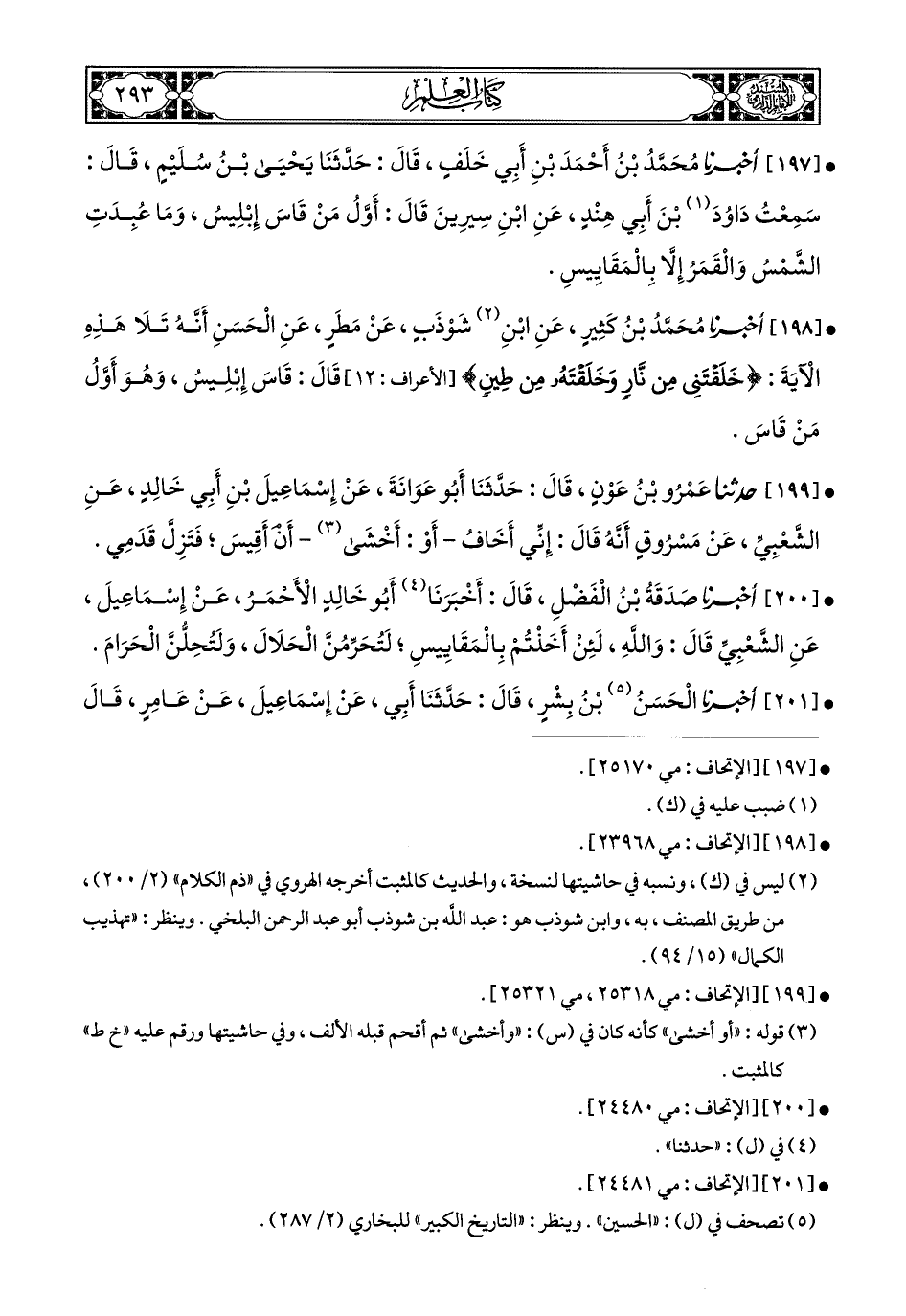 200- أَخبَرَنا صَدَقَةُ بْنُ الْفَضْلِ, قَالَ: أَخبَرَنا أَبُو خَالِدٍ الأَحْمَرُ, عَنْ إِسْمَاعِيلَ, عَنِ الشَّعْبِيِّ, قَالَ: وَاللهِ لَئِنْ أَخَذْتُمْ بِالْمَقَايِيسِ لَتُحَرِّمُنَّ الْحَلاَلَ وَلَتُحِلُّنَّ الْحَرَامَ.