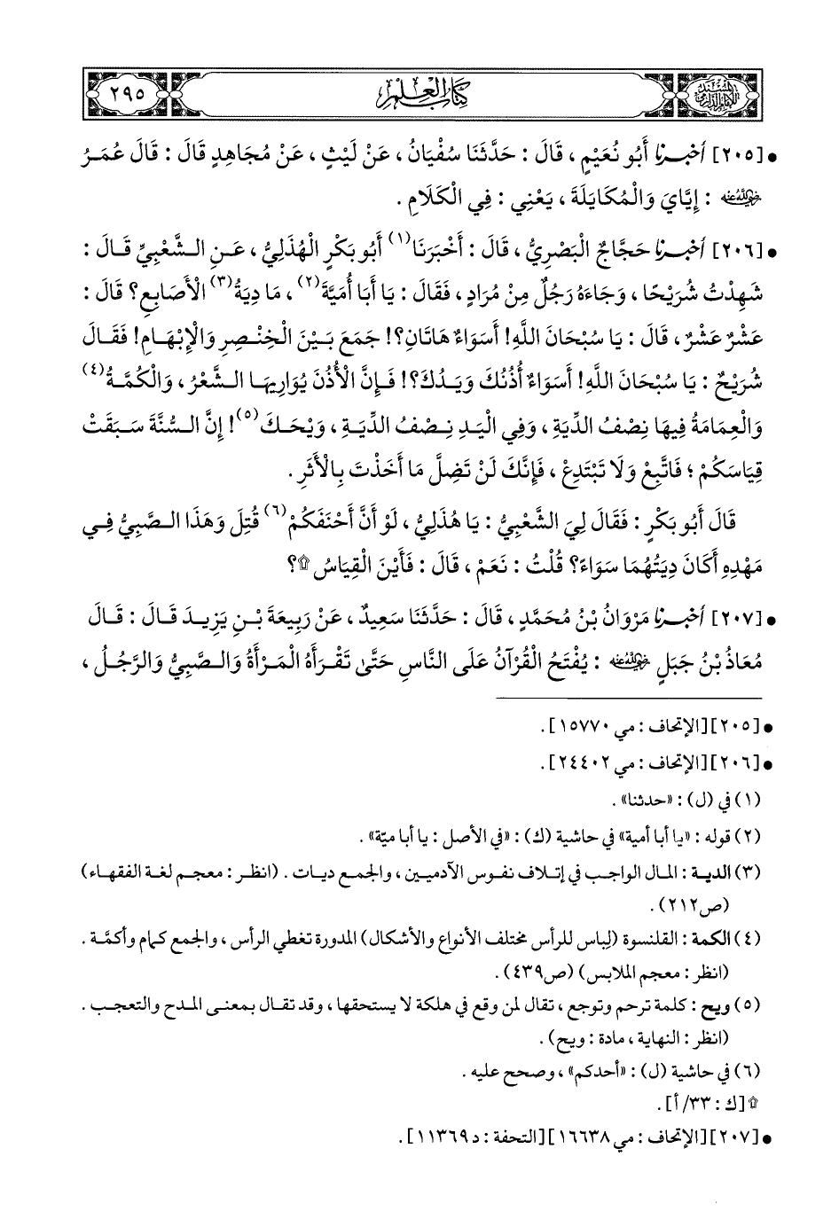 205- أَخبَرَنا أَبُو نُعَيْمٍ, قَالَ: حَدَّثَنَا سُفْيَانُ, عَنْ لَيْثٍ, عَنْ مُجَاهِدٍ, قَالَ: قَالَ عُمَرُ رَضِيَ اللهُ عَنْهُ: إِيَّايَ وَالْمُكَايَلَةَ, يَعْنِي فِي الْكَلاَمِ.