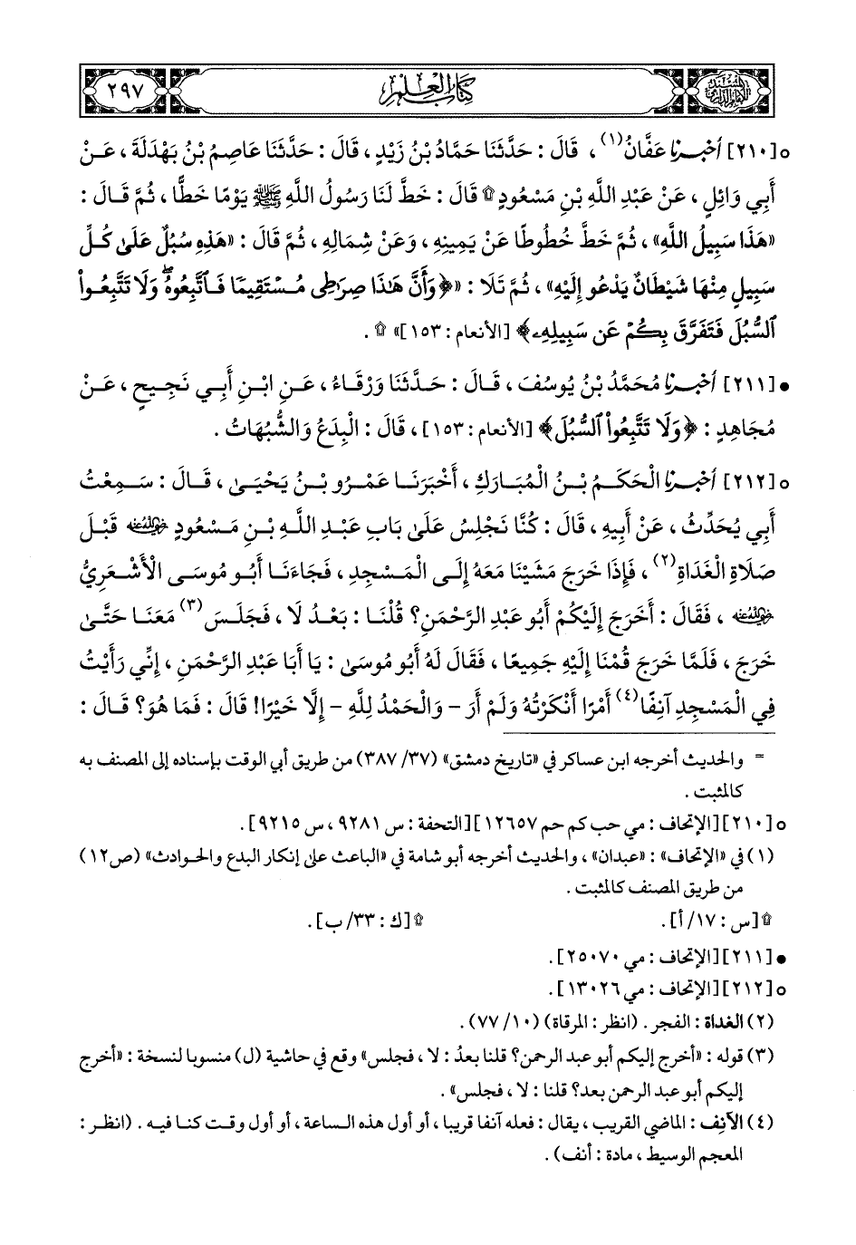 210- أَخبَرَنا عَفَّانُ (1), قَالَ: حَدَّثَنَا حَمَّادُ بْنُ زَيْدٍ, قَالَ: حَدَّثَنَا عَاصِمُ بْنُ بَهْدَلَةَ, عَنْ أَبِي وَائِلٍ, عَنْ عَبْدِ اللهِ بْنِ مَسْعُودٍ, قَالَ: خَطَّ لَنَا رَسُولُ اللهِ صَلى الله عَليهِ وسَلم يَوْمًا خَطًّا, ثُمَّ قَالَ: هَذَا سَبِيلُ اللهِ, ثُمَّ خَطَّ خُطُوطًا عَنْ يَمِينِهِ, وَعَنْ شِمَالِهِ, ثُمَّ قَالَ: هَذِهِ سُبُلٌ, عَلَى كُلِّ سَبِيلٍ مِنْهَا شَيْطَانٌ يَدْعُو إِلَيْهِ, ثُمَّ تَلاَ: {وَأَنَّ هَذَا صِرَاطِي مُسْتَقِيمًا فَاتَّبِعُوهُ وَلاَ تَتَّبِعُوا السُّبُلَ فَتَفَرَّقَ بِكُمْ عَنْ سَبِيلِهِ} (2).