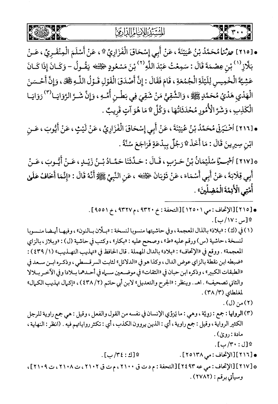 215- حَدَّثَنَا مُحَمَّدُ بْنُ عُيَيْنَةَ, عَنْ أَبِي إِسْحَاقَ الْفَزَارِيِّ, عَنْ أَسْلَمَ الْمِنْقَرِيِّ, عَنْ بَلاَّزِ بْنِ عِصْمَةَ, قَالَ: سَمِعْتُ عَبْدَ اللهِ بْنَ مَسْعُودٍ رَضِيَ اللهُ عَنْهُ, يَقُولُ, وَكَانَ إِذَا كَانَ عَشِيَّةَ الْخَمِيسِ لِلَيْلَةِ (1) الْجُمُعَةِ, قَامَ فَقَالَ: إِنَّ أَصْدَقَ الْقَوْلِ قَوْلُ اللهِ عَزَّ وَجَلَّ, وَإِنَّ أَحْسَنَ الْهَدْيِ هَدْيُ مُحَمَّدٍ, وَالشَّقِيُّ مَنْ شَقِيَ فِي بَطْنِ أُمِّهِ, وَإِنَّ شَرَّ الرَّوَايَا رَوَايَا الْكَذِبِ, وَشَرَّ الأُمُورِ مُحْدَثَاتُهَا, وَكُلَّ مَا هُوَ آتٍ قَرِيبٌ.