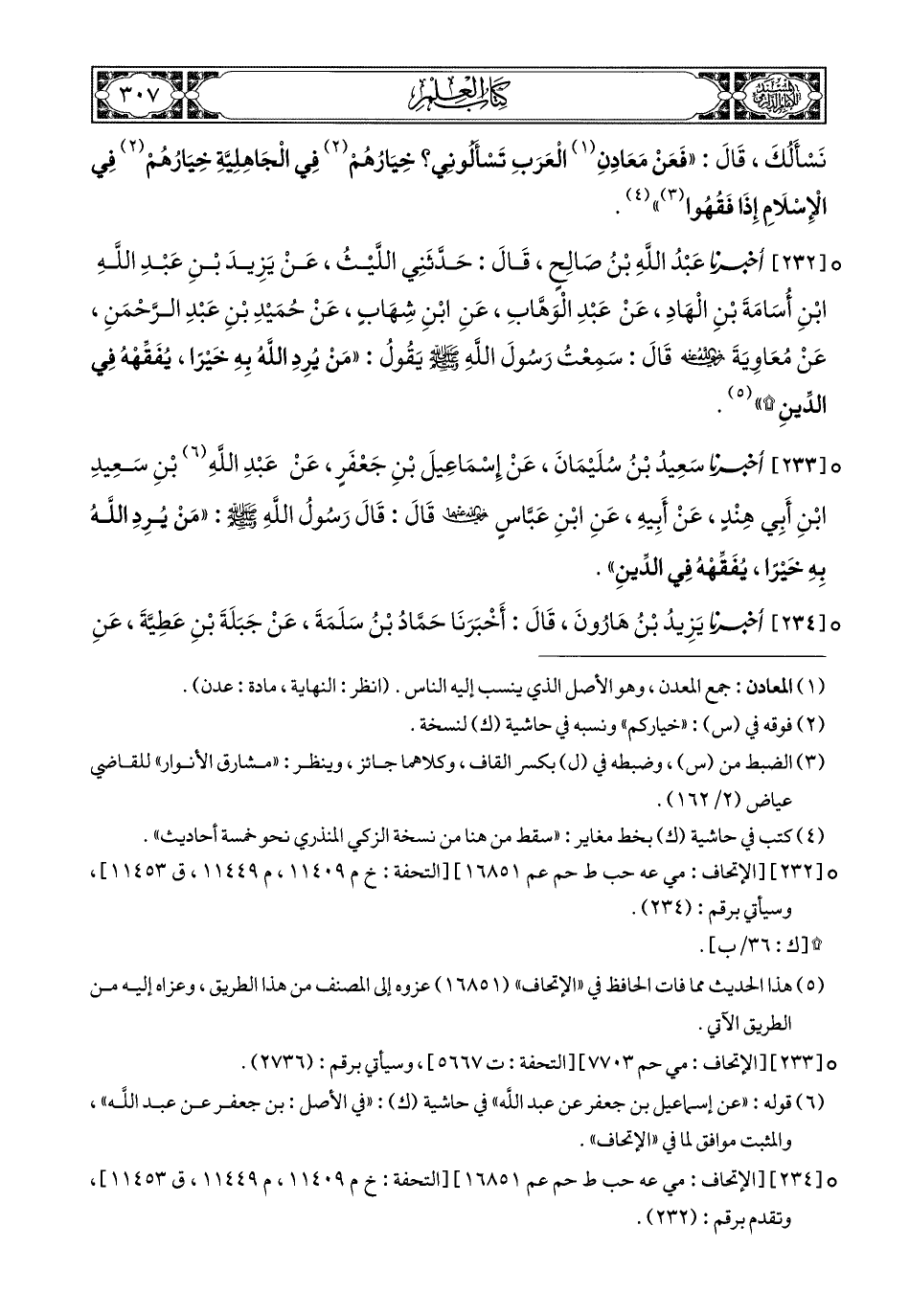 232- أَخبَرَنا عَبْدُ اللهِ بْنُ صَالِحٍ, قَالَ: حَدَّثَنِي اللَّيْثُ, عَنْ يَزِيدَ بْنِ عَبْدِ اللهِ بْنِ أُسَامَةَ بْنِ الْهَادِ, عَنْ عَبْدِ الْوَهَّابِ, عَنِ ابْنِ شِهَابٍ, عَنْ حُمَيْدِ بْنِ عَبْدِ الرَّحْمَنِ, عَنْ مُعَاوِيَةَ رَضِيَ اللهُ عَنْهُ, قَالَ: سَمِعْتُ رَسُولَ اللهِ صَلى الله عَليهِ وسَلم يَقُولُ: مَنْ يُرِدِ اللهُ بِهِ خَيْرًا يُفَقِّهْهُ فِي الدِّينِ (1).