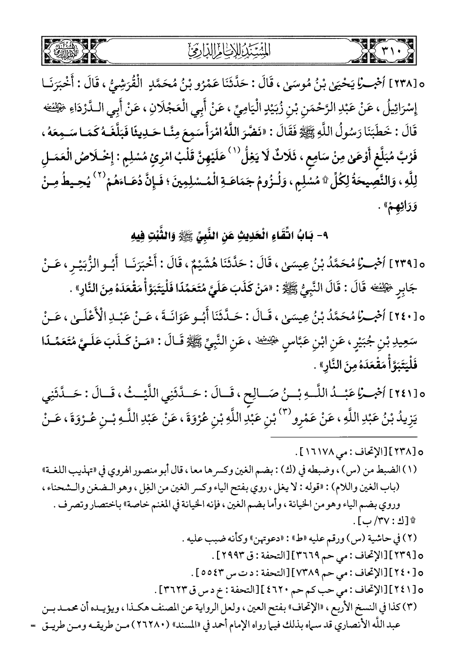 238- أَخبَرَنا يَحْيَى بْنُ مُوسَى, قَالَ: حَدَّثَنَا عَمْرُو بْنُ مُحَمَّدٍ الْقُرَشِيُّ, قَالَ: أَخبَرَنا إِسْرَائِيلُ, عَنْ عَبْدِ الرَّحْمَنِ بْنِ زُبَيْدٍ الْيَامِيِّ, عَنْ أَبِي الْعَجْلاَنِ, عَنْ أَبِي الدَّرْدَاءِ رَضِيَ اللهُ عَنْهُ, قَالَ: خَطَبَنَا رَسُولُ اللهِ صَلى الله عَليهِ وسَلم, فَقَالَ: نَضَّرَ اللهُ امْرَءًا سَمِعَ مِنَّا حَدِيثًا فَبَلَّغَهُ كَمَا سَمِعَهُ, فَرُبَّ مُبَلَّغٍ أَوْعَى مِنْ سَامِعٍ, ثَلاَثٌ لاَ يَغِلُّ عَلَيْهِنَّ قَلْبُ امْرِئٍ مُسْلِمٍ: إِخْلاَصُ الْعَمَلِ لِلَّهِ, وَالنَّصِيحَةُ لِكُلِّ مُسْلِمٍ وَلُزُومُ جَمَاعَةِ الْمُسْلِمِينَ فَإِنَّ دُعَاءَهُمْ يُحِيطُ (1) مِنْ وَرَائِهِمْ.
