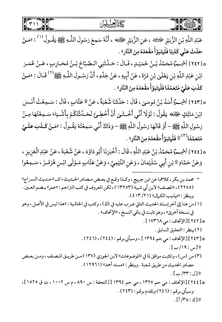 244- أَخبَرَنا مُحَمَّدُ بْنُ عَبْدِ اللهِ, قَالَ: أَخبَرَنا أَبُو دَاوُدَ, عَنْ شُعْبَةَ, عَنْ عَبْدِ الْعَزِيزِ, وَعَنْ حَمَّادِ بْنِ أَبِي سُلَيْمَانَ, وَعَنِ التَّيْمِيِّ, وَعَنْ عَتَّابٍ, مَوْلَى ابْنِ هُرْمُزَ, سَمِعُوا أَنَسَ بْنَ مَالِكٍ رَضِيَ اللهُ عَنْهُ (1), عَنِ النَّبِيِّ صَلى الله عَليهِ وسَلم أَنَّهُ قَالَ: مَنْ كَذَبَ عَلَيَّ مُتَعَمِّدًا فَلْيَتَبَوَّأْ مَقْعَدَهُ مِنَ النَّارِ.