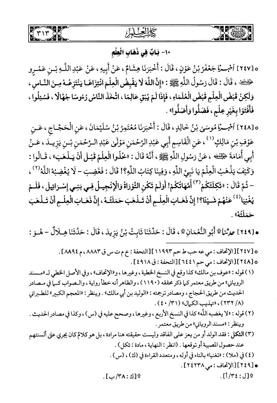 248- أَخبَرَنا مُوسَى بْنُ خَالِدٍ, قَالَ: أَخبَرَنا مُعْتَمِرُ بْنُ سُلَيْمَانَ, عَنِ الْحَجَّاجِ, عَنْ عَوْفِ بْنِ مَالِكٍ (1), عَنِ الْقَاسِمِ أَبِي عَبْدِ الرَّحْمَنِ, مَوْلَى عَبْدِ الرَّحْمَنِ بْنِ يَزِيدَ, عَنْ أَبِي أُمَامَةَ رَضِيَ اللهُ عَنْهُ, عَنْ رَسُولِ اللهِ صَلى الله عَليهِ وسَلم أَنَّهُ قَالَ: خُذُوا الْعِلْمَ قَبْلَ أَنْ يَذْهَبَ, قَالُوا: وَكَيْفَ يَذْهَبُ الْعِلْمُ يَا نَبِيَّ اللهِ, وَفِينَا كِتَابُ اللهِ؟ قَالَ: فَغَضِبَ لاَ يُغْضِبُهُ اللهُ, ثُمَّ قَالَ: ثَكِلَتْكُمْ أُمَّهَاتُكُمْ, أَوَلَمْ تَكُنِ التَّوْرَاةُ وَالإِنْجِيلُ فِي بَنِي إِسْرَائِيلَ, فَلَمْ يُغْنِيَا عَنْهُمْ شَيْئًا, إِنَّ ذَهَابَ الْعِلْمِ أَنْ تَذْهَبَ حَمَلَتُهُ, إِنَّ ذَهَابَ الْعِلْمِ أَنْ تَذْهَبَ حَمَلَتُهُ.