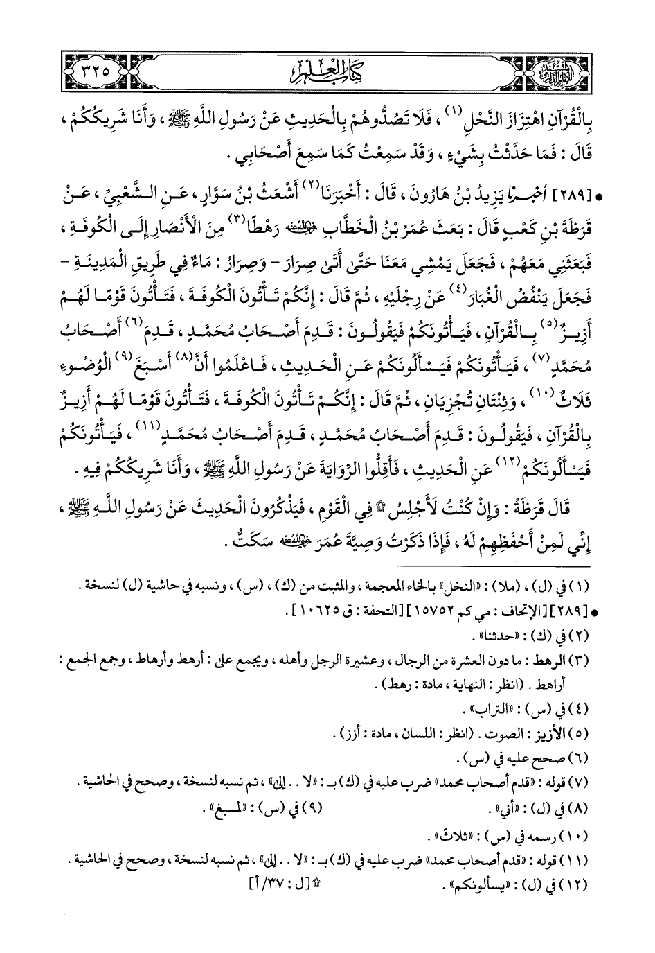 289- أَخبَرَنا يَزِيدُ بْنُ هَارُونَ, قَالَ: أَخبَرَنا أَشْعَثُ بْنُ سَوَّارٍ, عَنِ الشَّعْبِيِّ, عَنْ قَرَظَةَ بْنِ كَعْبٍ, قَالَ: بَعَثَ عُمَرُ بْنُ الْخَطَّابِ رَضِيَ اللهُ عَنْهُ رَهْطًا مِنَ الأَنْصَارِ إِلَى الْكُوفَةِ, فَبَعَثَنِي مَعَهُمْ, فَجَعَلَ يَمْشِي مَعَنَا حَتَّى أَتَى صِرَارَ, وَصِرَارُ مَاءٌ فِي طَرِيقِ الْمَدِينَةِ, فَجَعَلَ يَنْفُضُ الغُبارَ عَنْ رِجْلَيْهِ, ثُمَّ قَالَ: إِنَّكُمْ تَأْتُونَ الْكُوفَةَ, فَتَأْتُونَ قَوْمًا لَهُمْ أَزِيزٌ بِالْقُرْآنِ, فَيَأْتُونَكُمْ, فَيَقُولُونَ: قَدِمَ أَصْحَابُ مُحَمَّدٍ, قَدِمَ أَصْحَابُ مُحَمَّدٍ, فَيَأْتُونَكُمْ, فَيَسْأَلُونَكُمْ عَنِ الْحَدِيثِ, فَاعْلَمُوا أَنَّ أَسْبَغَ الْوُضُوءِ ثَلاَثٌ, وَثِنْتَانِ تُجْزِيَانِ, ثُمَّ قَالَ: إِنَّكُمْ تَأْتُونَ الْكُوفَةَ, فَتَأْتُونَ قَوْمًا لَهُمْ أَزِيزٌ بِالْقُرْآنِ فَيَقُولُونَ: قَدِمَ أَصْحَابُ مُحَمَّدٍ قَدِمَ أَصْحَابُ مُحَمَّدٍ, فَيَأْتُونَكُمْ فَيَسْأَلُونَكُمْ عَنِ الْحَدِيثِ, فَأَقِلُّوا الرِّوَايَةَ عَنْ رَسُولِ اللهِ صَلى الله عَليهِ وسَلم, وَأَنَا شَرِيكُكُمْ فِيهِ.