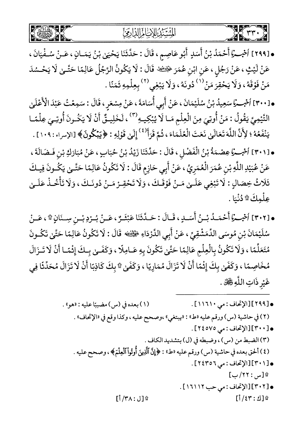 299- أَخبَرَنا أَحْمَدُ بْنُ أَسَدٍ, أَبُو عَاصِمٍ, قَالَ: حَدَّثَنَا يَحْيَى بْنُ يَمَانٍ, عَنْ سُفْيَانَ, عَنْ لَيْثٍ, عَنْ رَجُلٍ, عَنِ ابْنِ عُمَرَ رَضِيَ اللهُ عَنْهُ, قَالَ: لاَ يَكُونُ الرَّجُلُ عَالِمًا حَتَّى لاَ يَحْسُدَ مَنْ فَوْقَهُ, وَلاَ يَحْقِرَ مَنْ دُونَهُ, وَلاَ يَبْغِي (1) بِعِلْمِهِ ثَمَنًا.