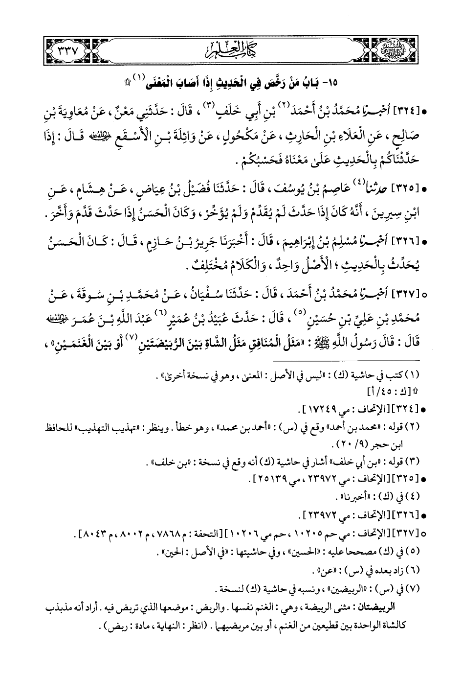 324- أَخبَرَنا مُحَمَّدُ بْنُ أَحْمَدَ بْنِ أَبِي خَلَفٍ, قَالَ: حَدَّثَنِي مَعْنٌ, عَنْ مُعَاوِيَةَ بْنِ صَالِحٍ, عَنِ الْعَلاَءِ بْنِ الْحَارِثِ, عَنْ مَكْحُولٍ, عَنْ وَاثِلَةَ بْنِ الأَسْقَعِ رَضِيَ اللهُ عَنْهُ, قَالَ: إِذَا حَدَّثْنَاكُمْ بِالْحَدِيثِ عَلَى مَعْنَاهُ فَحَسْبُكُمْ.