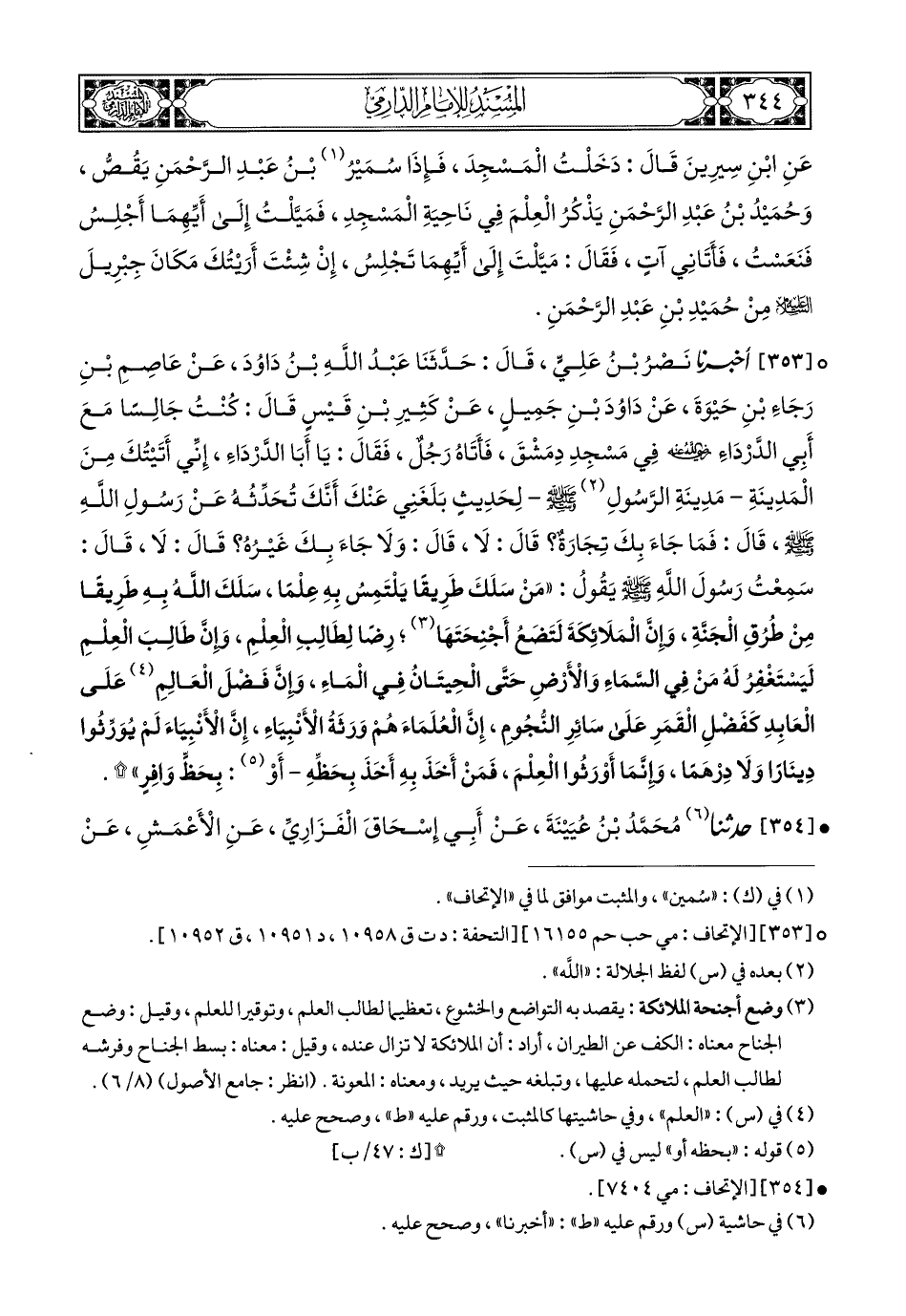 353- أَخبَرَنا نَصْرُ بْنُ عَلِيٍّ, قَالَ: حَدَّثَنَا عَبْدُ اللهِ بْنُ دَاوُدَ, عَنْ عَاصِمِ بْنِ رَجَاءِ بْنِ حَيْوَةَ, عَنْ دَاوُدَ بْنِ جَمِيلٍ, عَنْ كَثِيرِ بْنِ قَيْسٍ قَالَ: كُنْتُ جَالِسًا مَعَ أَبِي الدَّرْدَاءِ رَضِيَ اللهُ عَنْهُ, فِي مَسْجِدِ دِمَشْقَ, فَأَتَاهُ رَجُلٌ, فَقَالَ: يَا أَبَا الدَّرْدَاءِ, إِنِّي أَتَيْتُكَ مِنَ الْمَدِينَةِ, مَدِينَةِ الرَّسُولِ صَلى الله عَليهِ وسَلم, لِحَدِيثٍ بَلَغَنِي عَنْكَ أَنَّكَ تُحَدِّثُهُ عَنْ رَسُولِ اللهِ صَلى الله عَليهِ وسَلم, قَالَ: فَمَا جَاءَ بِكَ تِجَارَةٌ؟ قَالَ: لاَ, قَالَ: وَلاَ جَاءَ بِكَ غَيْرُهُ؟ قَالَ: لا, قَالَ: سَمِعْتُ رَسُولَ اللهِ صَلى الله عَليهِ وسَلم يَقُولُ: مَنْ سَلَكَ طَرِيقًا يَلْتَمِسُ بِهِ عِلْمًا, سَلَكَ اللهُ بِهِ طَرِيقًا مِنْ طُرُقِ الْجَنَّةِ, وَإِنَّ الْمَلاَئِكَةَ لَتَضَعُ أَجْنِحَتَهَا رِضًا لِطَالِبِ الْعِلْمِ, وَإِنَّ طَالِبَ الْعِلْمِ لَيَسْتَغْفِرُ لَهُ مَنْ فِي السَّمَاءِ وَالأَرْضِ, حَتَّى الْحِيتَانُ فِي الْمَاءِ, وَإِنَّ فَضْلَ الْعَالِمِ عَلَى الْعَابِدِ كَفَضْلِ الْقَمَرِ عَلَى سَائِرِ النُّجُومِ, إِنَّ الْعُلَمَاءَ هم وَرَثَةُ الأَنْبِيَاءِ, إِنَّ الأَنْبِيَاءَ لَمْ يُوَرِّثُوا دِينَارًا, وَلاَ دِرْهَمًا, وَإِنَّمَا أَوْرَثُوا الْعِلْمَ فَمَنْ أَخَذَ بِهِ أَخَذَ بِحَظِّهِ, أَوْ بِحَظٍّ وَافِرٍ.