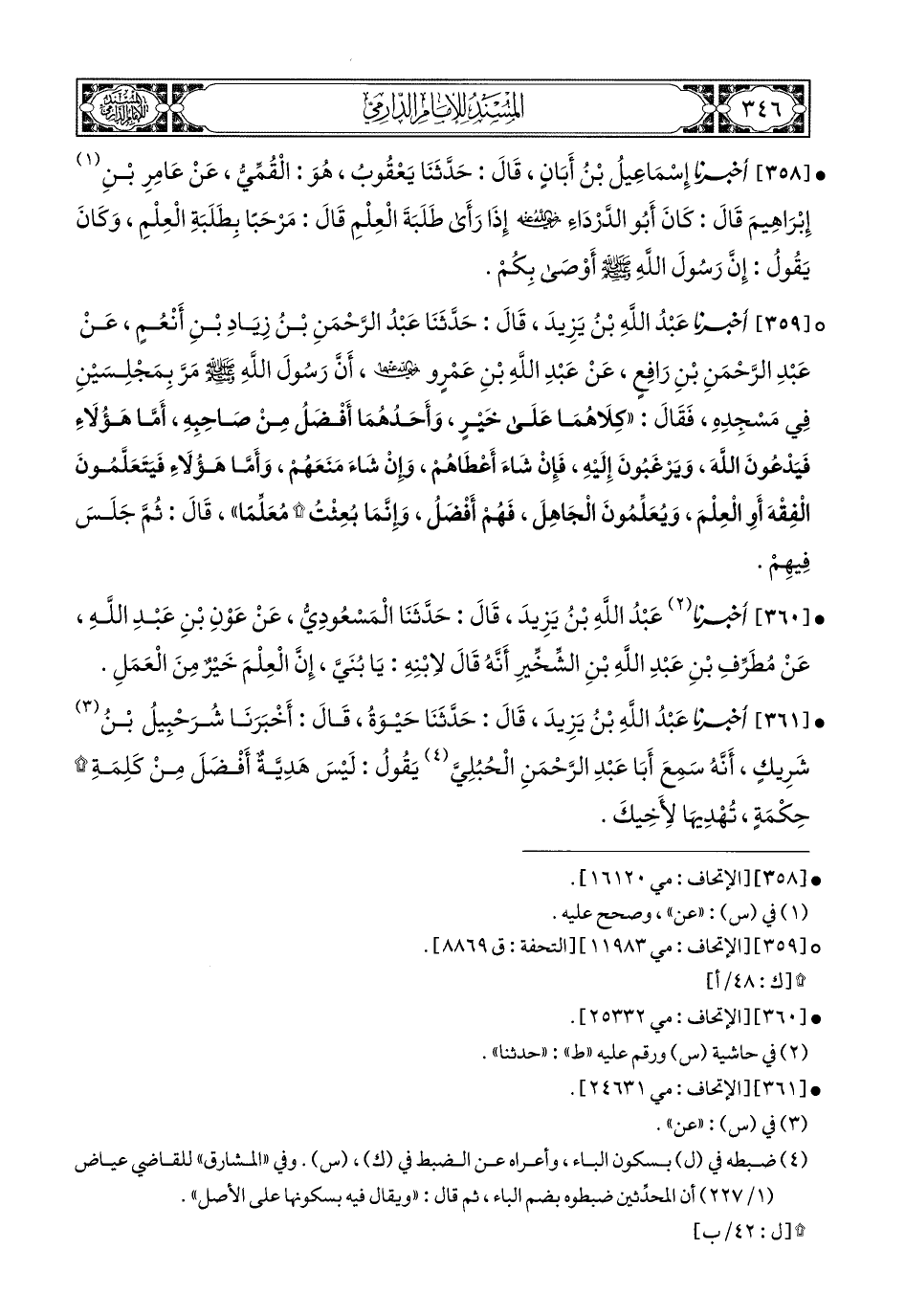 360- أَخبَرَنا عَبْدُ اللهِ بْنُ يَزِيدَ, قَالَ: حَدَّثَنَا الْمَسْعُودِيُّ, عَنْ عَوْنِ بْنِ عَبْدِ اللهِ, عَنْ مُطَرِّفِ بْنِ عَبْدِ اللهِ بْنِ الشِّخِّيرِ, أَنَّهُ قَالَ لاِبْنِهِ: يَا بُنَيَّ, إِنَّ الْعِلْمَ خَيْرٌ مِنَ الْعَمَلِ.