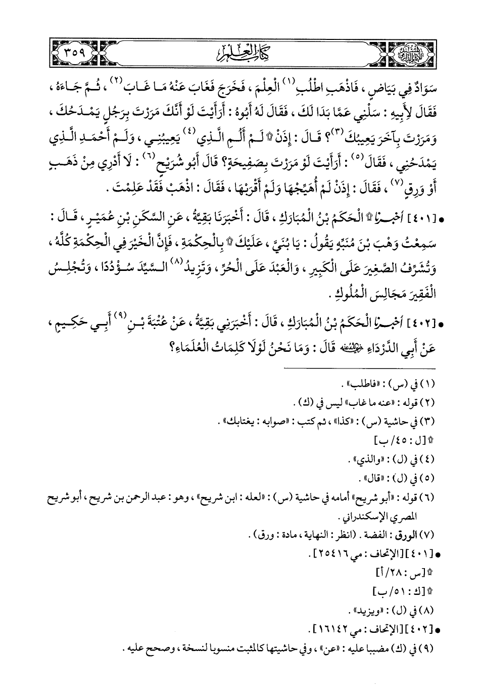 402- أَخبَرَنا الْحَكَمُ بْنُ الْمُبَارَكِ, قَالَ: أَخبَرَنِي بَقِيَّةُ, عَنْ عُتْبَةَ بْنِ أَبِي حَكِيمٍ, عَنْ أَبِي الدَّرْدَاءِ رَضِيَ اللهُ عَنْهُ, قَالَ: وَمَا نَحْنُ لَوْلاَ كَلِمَاتُ الْعُلَمَاءِ.