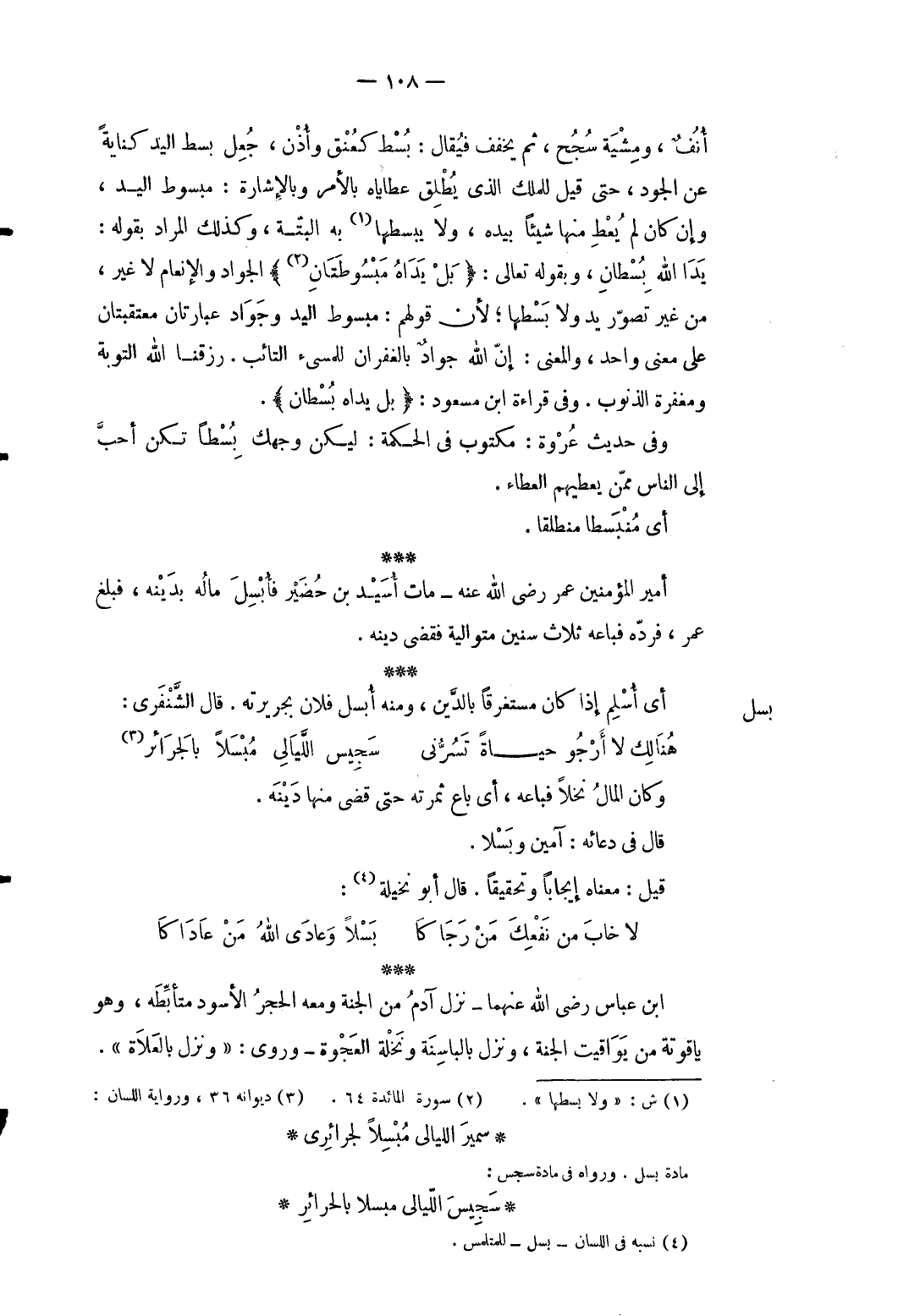 أنف ومشية سجح ثمَّ يُخَفف فَيُقَال: بسط كعنق وَأذن جُعل بسط الْيَد كِنَايَة عَن الْجُود حَتَّى قيل للْملك الَّذِي يُطلق عطاياه بِالْأَمر وبالإشارة: مَبْسُوط الْيَد وَإِن كَانَ لم يُعْط مِنْهَا شَيْئا بِيَدِهِ لَوْلَا يبسطها بِهِ البته وَكَذَلِكَ المُرَاد بقوله: يدالله بسطان وَبِقَوْلِهِ تَعَالَى: {بَلْ يَدَاهُ مَبْسُوطَتَانِ} ) الْجواد والإنعام لاغير ن من غير تصور يَد وَلَا بسطها لِأَن قَوْلهم: مَبْسُوط الْيَد وجواد عبارتان متعقبتان على معنى وَاحِد وَالْمعْنَى: إِن الله جواد بالغفران للمسيء التائب. رزقنا الله التَّوْبَة ومغفرة الذُّنُوب وَفِي قِرَاءَة ابْن مَسْعُود ك (بل يَدَاهُ بُسْطان) وَفِي حَدِيث عُرْوَة: مَكْتُوب فِي الْحِكْمَة: ليكن وَجهك بسطاً تكن أحب إِلَى النَّاس مِمَّن يعطيهم الْعَطاء. أَي منبسطا مُنْطَلقًا. أَمِير الْمُؤمنِينَ عمر رَضِي الله عَنهُ مَاتَ أُسيد بن حضير فأُبسل مَاله بِدِينِهِ فَبلغ عمر فَرده فَبَاعَهُ ثَلَاث سِنِين مُتَوَالِيَة فَقضى دينه.