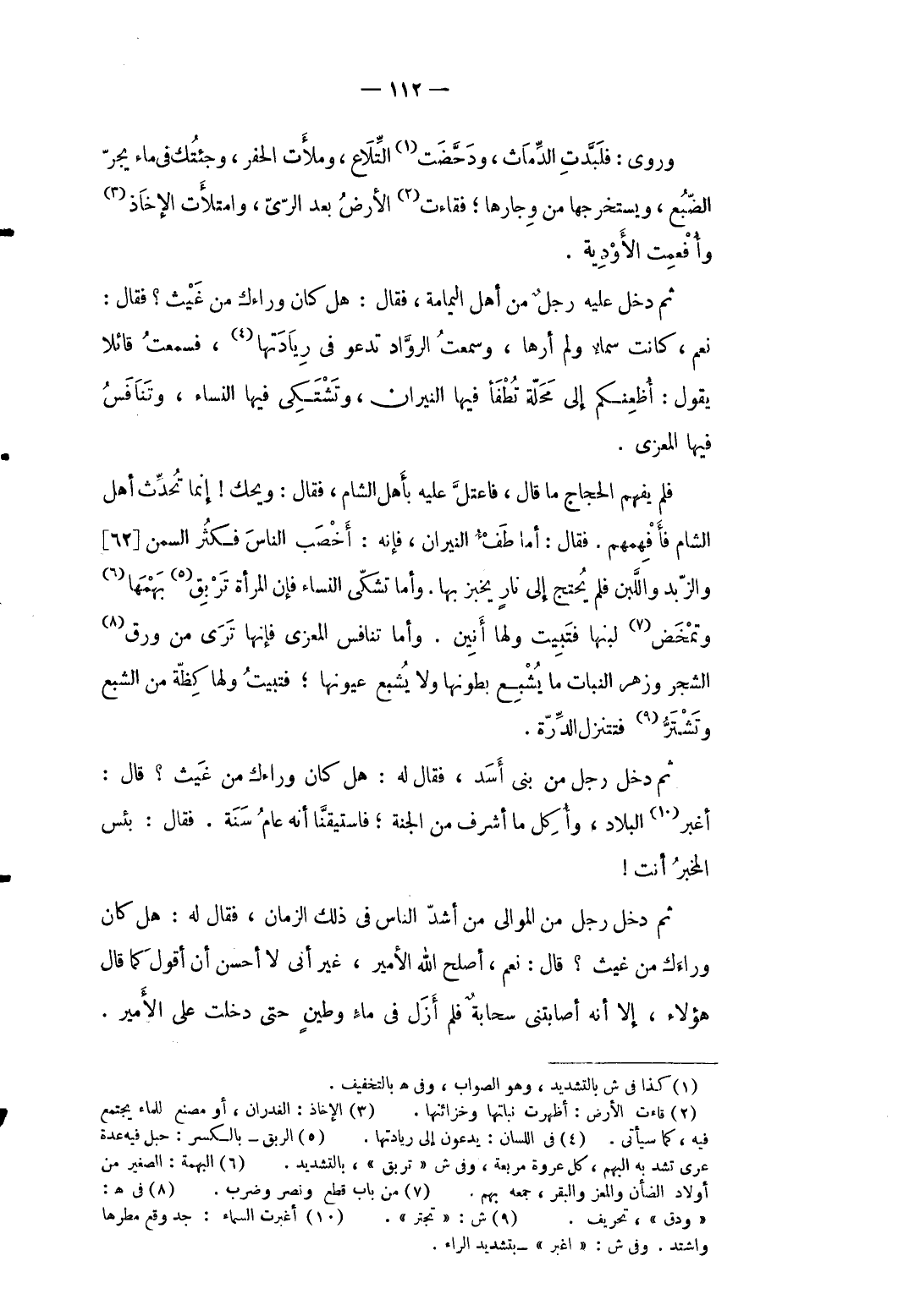 وَرُوِيَ: فبلدت الدماث ودحضت التلاع وملأت الْحفر وجئتك فِي مَاء يجرّ الضبع ويستخرجها من وجارها فقاءت الأَرْض بعد الرّيّ وامتلأت الإخاذ وأفعمت الأودية. ثمَّ دخل عَلَيْهِ رجل من أهل الْيَمَامَة فَقَالَ: هَل كَانَ وَرَاءَك من غيث فَقَالَ نعم كَانَت سماءٌ وَلم أرها وَسمعت الرواد تَدْعُو فِي ريادتها فَسمِعت قَائِلا يَقُول: أُظعنكم إِلَى محلّة تطفأ فِيهَا النيرَان وتشتكي فِي النِّسَاء وتنافس فِيهَا المعزى. فَلم يفهم الْحجَّاج ماقال فاعتل عَلَيْهِ بِأَهْل الشَّام فَقَالَ وَيحك إِنَّمَا تحدث أهل الشَّام فأفهمهم. فَقَالَ: أما طفءُ النيرَان فَإِنَّهُ: أخصب النَّاس فَكثر السّمن (62) والزبد وَاللَّبن فَلم يحْتَج إِلَى نَار يخبزه بهَا. وَأما تشكي النِّسَاء فَإِن الْمَرْأَة تربق بهمها وتمخض لَبنهَا فتبيت وَلها أَنِين وَأما تنافس المعزى فَإِنَّهَا ترى من ورق الشّجر وزهرة النَّبَات مَا يشْبع بطونها وَلَا يُشبع عيونها فتبيت وَلها كظة من الشِّبَع وتشتر فتتنزل الدرة ثمَّ دجخل رجل من بني أَسد ن فَقَالَ لَهُ: هَل كَانَ وَرَاءَك منغيث قَالَ أغبر الْبِلَاد وَأكل مَا أشرف من الْجنَّة فتبيت وَلها كظلة من الشبغ وتشتر فتتنزل الدرة. ثمَّ دخل رجل من بني أَسد ن فَقَالَ لَهُ: هَل كَانَ وَرَاءَك من غيث قَالَ أغبر الْبِلَاد وَأكل مَا أشرف من الْجنَّة فاستيقنا أَنه عَام سنة. فَقَالَ: بئس الْخَبَر أَنْت ثمَّ دخل رجل من الموَالِي من أَشد النَّاس فِي ذَلِك الزَّمَان فَقَالَ لَهُ: هَل كَانَ وَرَاءَك من غيث قَالَ: نعم أصلح الله الْأَمِير غير أَنِّي لَا أحسن أَن أَقُول كَمَا قَالَ هَؤُلَاءِ إِلَّا أَنه أصابتني سَحَابَة فَلم أزل فِي ماءٍ وطينٍ حَتَّى دخلت على الْأَمِير.