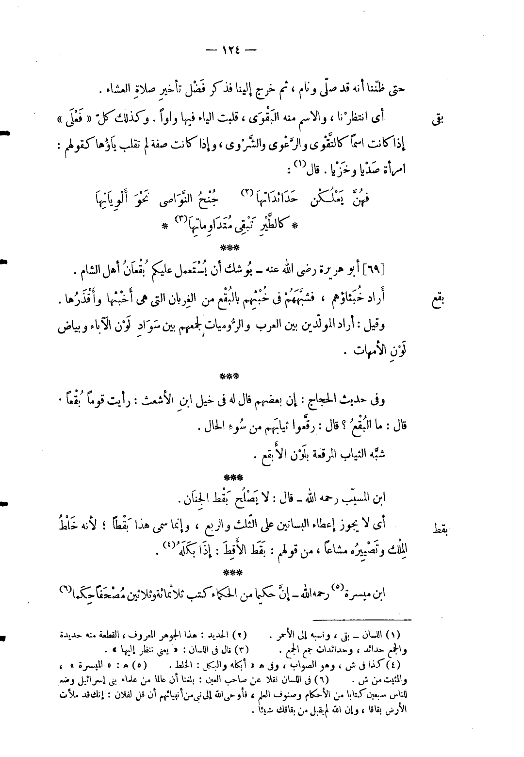 بقط أَي لايجوز إِعْطَاء الْبَسَاتِين على الثُّلُث وَالرّبع وَإِنَّمَا سمي هَذَا بقطاً لِأَنَّهُ خلط الْملك وتصييره مشَاعا من قَوْلهم: بقط الأقط: إِذا بكله. ابْن ميسرَة رَحمَه الله إِن حكيما من الْحُكَمَاء كتب ثَلَاثمِائَة وَثَلَاثِينَ مُصحفا حكما