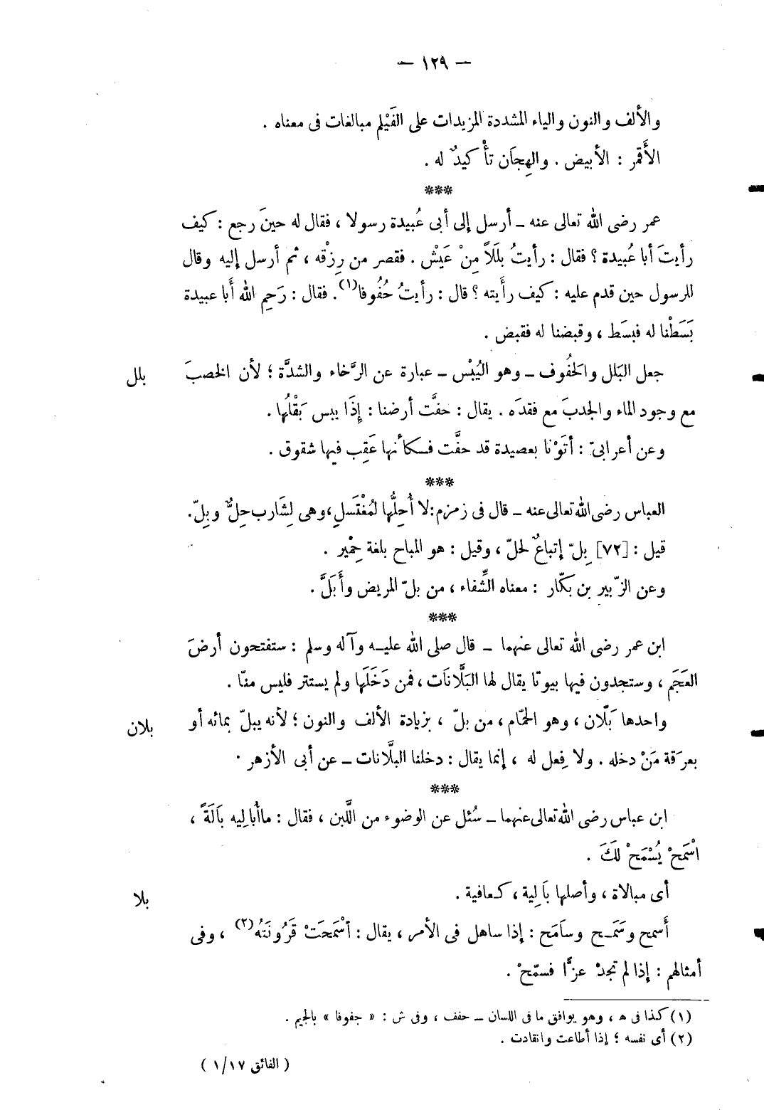 وَالْألف وَالنُّون وَالْيَاء الْمُشَدّدَة المزيدات على الفيلم مبالغات فِي مَعْنَاهُ. الْأَقْمَر: الْأَبْيَض والهجان تَأْكِيد لَهُ. عمر رَضِي الله تَعَالَى عَنهُ أرسل إِلَى أبي عُبَيْدَة رَسُولا فَقَالَ لَهُ حِين رَجَعَ: كَيفَ رَأَيْت ابا عُبَيْدَة فَقَالَ: رأيب بللا من عَيْش. فقصر من رزقه ثمَّ أرسل إِلَيْهِ وَقَالَ للرسول حِين قدم عَلَيْهِ: كَيفَ رَأَيْته قَالَ: رَأَيْت حفوفا. فَقَالَ: رحم الله أَبَا عُبَيْدَة بسطنا لَهُ فَبسط وقبضنا لَهُ فَقبض.