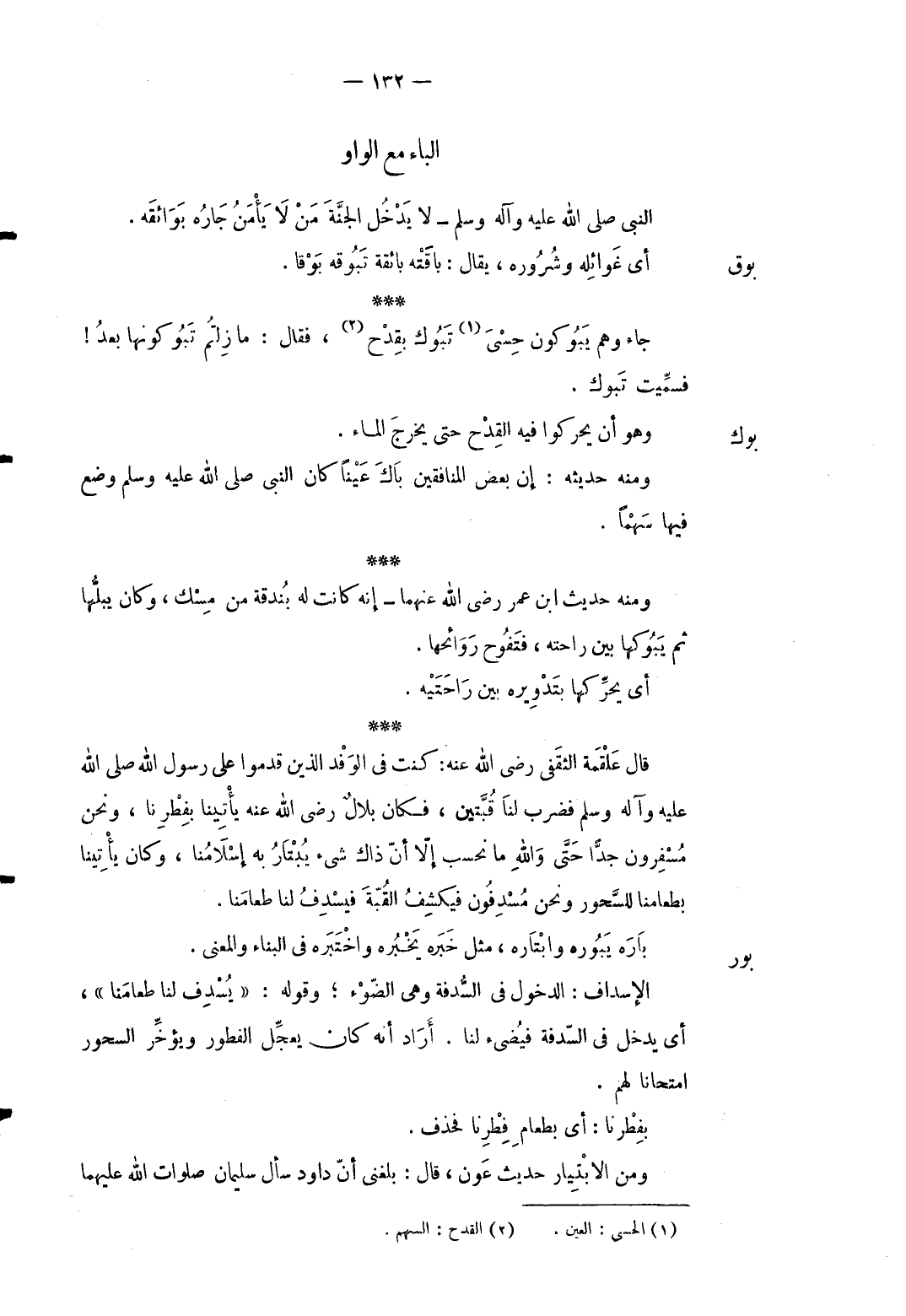 بوك: وَهُوَ أَن يحركوا فِيهِ الْقدح يخرج المَاء وَمِنْه حَدِيثه: إِن بعض المناقفين باك عينا كَانَ النَّبِي صلى الله عَلَيْهِ وَسلم وضع فِيهَا سَهْما. وَمِنْه حَدِيث ابْن عمر رَضِي الله عَنْهُمَا إِنَّه كَانَت لَهُ بندقة من مسك وَكَانَ يبلها ثمَّ يبوكها بَين رَاحَته فتفوح روائحها. أَي يحركها بتدويره بَين راحتيه. قَالَ عَلْقَمَة الثَّقَفِيّ رَضِي الله عَنهُ: كنت فِي الْوَفْد الَّذين قدمُوا على رَسُول الله صلى الله عَلَيْهِ وَسلم فَضرب لنا قبتين فَكَانَ بِلَال رَضِي الله عَنهُ يأتينا بفطرنا وَنحن مسفرون جدا حَتَّى وَالله مَا نحسب إِلَّا أَن ذَاك شَيْء يبتار بِهِ إسْلَامنَا وَكَانَ يأتينا بِطَعَامِنَا للسحور وَنحن مسدفون فَيكْشف الْقبَّة فيسدف لنا طعامنا.