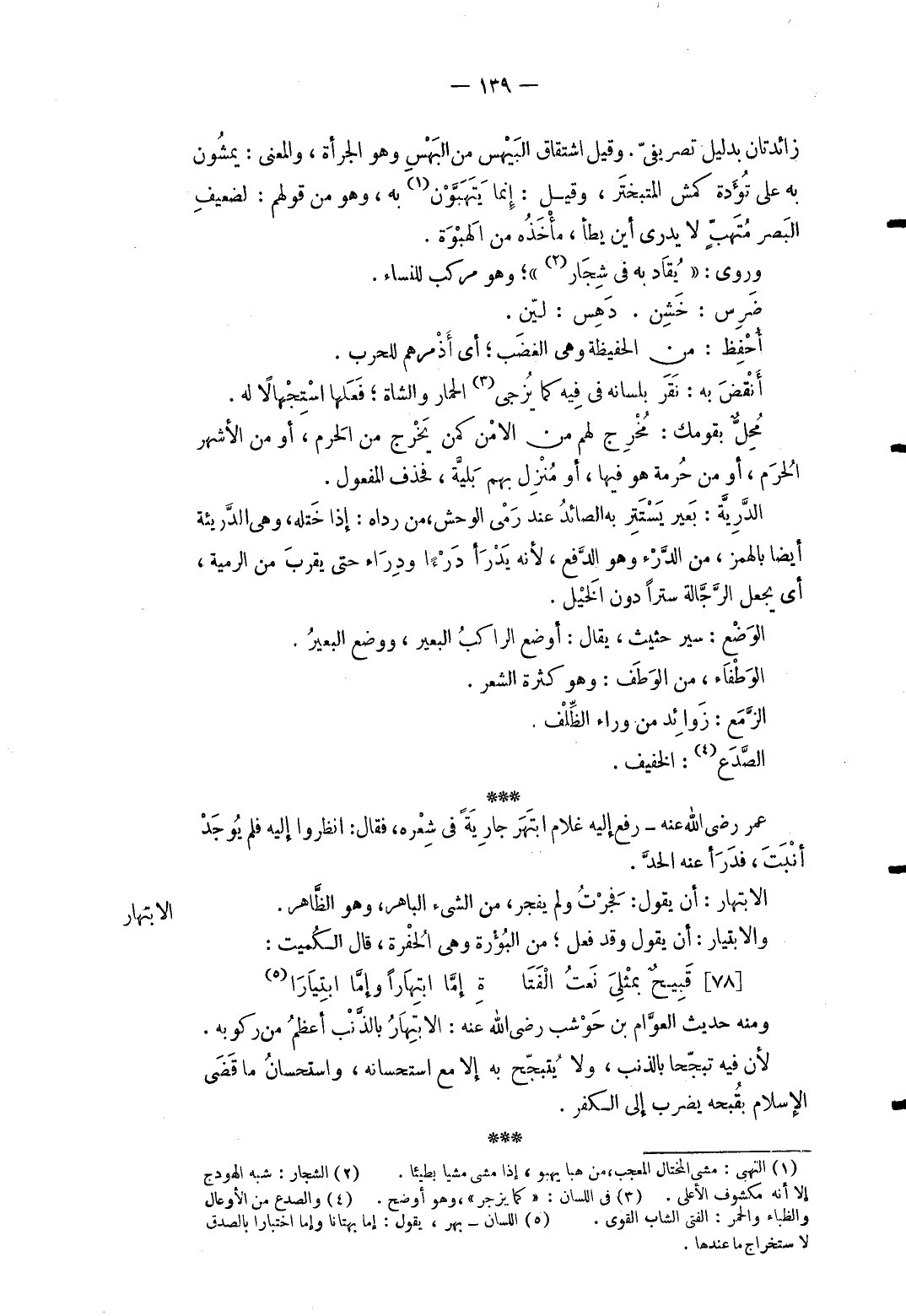 زائدتان بِدَلِيل تصريفي وَقيل اشتقاق البيهس من البهس وَهُوَ الجرأة وَالْمعْنَى: يَمْشُونَ بِهِ على تؤدة كمش المتبختر وَقيل: إِنَّمَا يتهبون بِهِ وَهُوَ من قَوْلهم: لضعيف الْبَصَر متهب لايدري أَيْن يطَأ مأخذه من الهبوة. وروى يُقَاد بِهِ فِي شجار وَهُوَ مركب للنِّسَاء. ضرس: خشن. دهس: لين. أُحفظ: من الحفيظة وَهِي الْغَضَب: أَي أذمرهم للحرب. أنقض بِهِ: نقر بِلِسَانِهِ فِي فِيهِ كَمَا يزجى الْحمار وَالشَّاة فعلهَا استجهالاً لَهُ. مَحل بقومك: مخرج لَهُم من الامن كمن يخرج من الْحرم أَو من الْأَشْهر الْحرم أَو من حُرْمَة هُوَ فِيهَا أَو منزل بهم بلية فَحذف الْمَفْعُول. الدرية بِغَيْر يسْتَتر بِهِ الصَّائِد عِنْد رمي الْوَحْش من رداه: إِذا ختله وَهِي الدريئة أَيْضا بِالْهَمْز من الدرء وَهُوَ الدّفع لِأَنَّهُ يدْرَأ دراء درءا حَتَّى يقرب من الرَّمية أَي يَجْعَل الرحالة ستر دون الْخَيل. الْوَضع: سير حثيث يُقَال: أوضع الرَّاكِب الْبَعِير وَوضع الْبَعِير. الوطفاء من الوطف: وَهُوَ كَثْرَة الشّعْر. الزمع: زَوَائِد من وَرَاء الظلْف. الصدع: الْخَفِيف. عمر رَضِي الله عَنهُ رفع إِلَيْهِ غُلَام ابتهر جَارِيَة فِي شعره فَقَالَ: انْظُرُوا إِلَيْهِ فَلم يُوجد أنبت فدرأ عَنهُ الْحَد