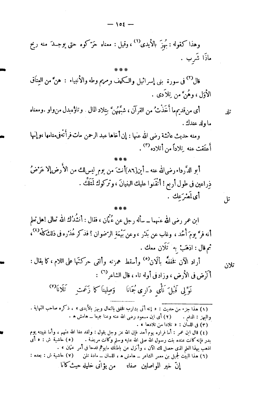 تَلد أَي من قديم مَا أخذت من الْقُرْآن شبههن بتلاد المَال. وتاؤه بدل من وَاو. وَمَعْنَاهُ ماولد عنْدك. وَمِنْه حَدِيث عَائِشَة رَضِي الله عَنْهَا: إِن أخاها عبد الرَّحْمَن مَاتَ فرأته فِي منامها وَإِنَّهَا أعتقت عَنهُ تلاداً من أتلاده. أَبُو الدَّرْدَاء رَضِي الله عَنهُ أَيْن [86] أَنْت من يَوْم لَيْسَ من الأَرْض إِلَّا عرض ذراعين فِي طول أَربع أتقنوا عَلَيْك الْبُنيان وَتَرَكُوك لمتلك.