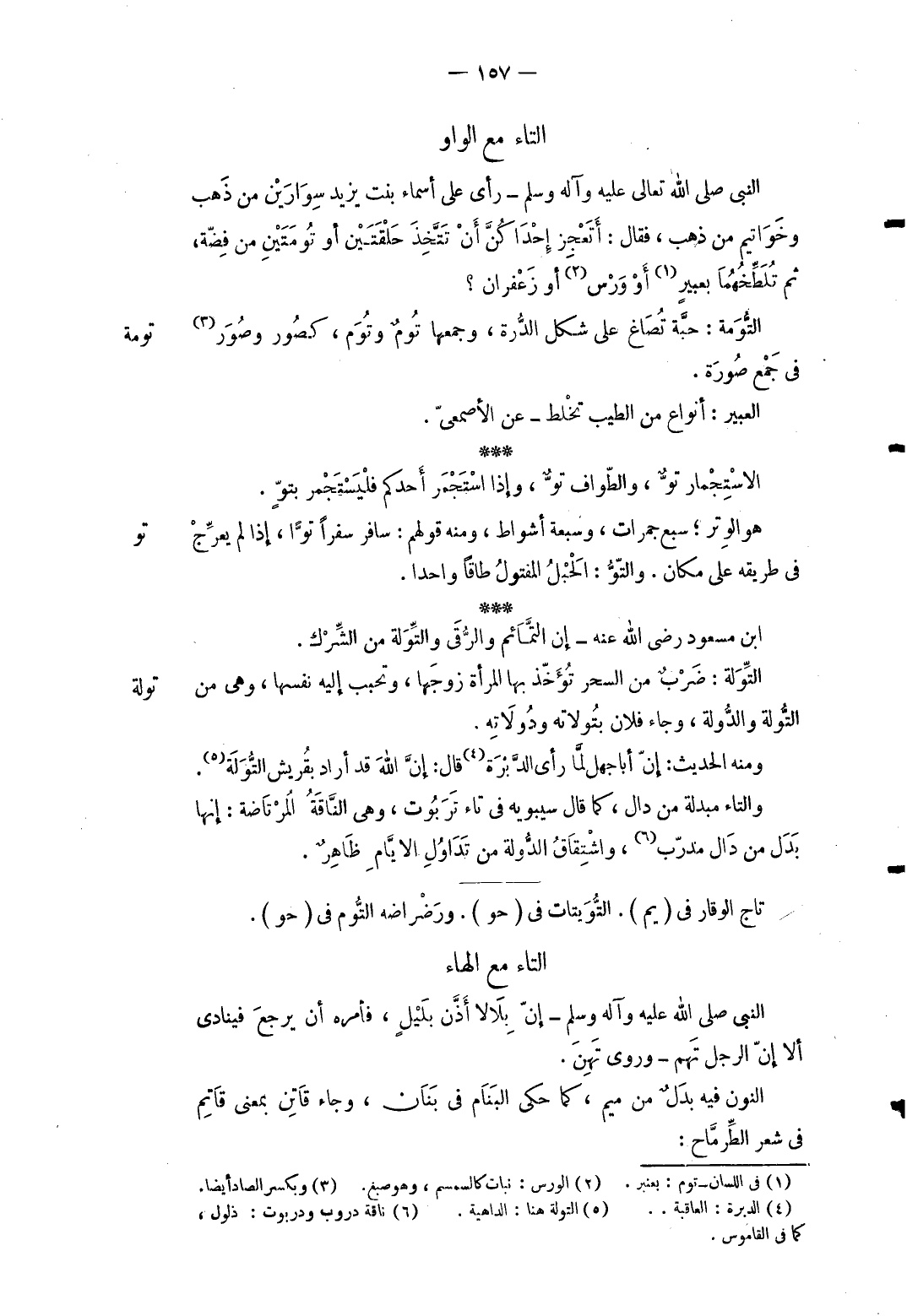 تومة فِي جمع صُورَة. العبير: أَنْوَاع من الطّيب تخلط عَن الْأَصْمَعِي. الِاسْتِجْمَار توٌّ وَالطّواف توٌّ وَإِذا استخمر أحدكُم فليستجمر بتوٍّ. هُوَ الْوتر سبع جمرات وَسَبْعَة أَشْوَاط وَمِنْه قَوْلهم: سَافر سفرا توَّا إِذا لم يعرج