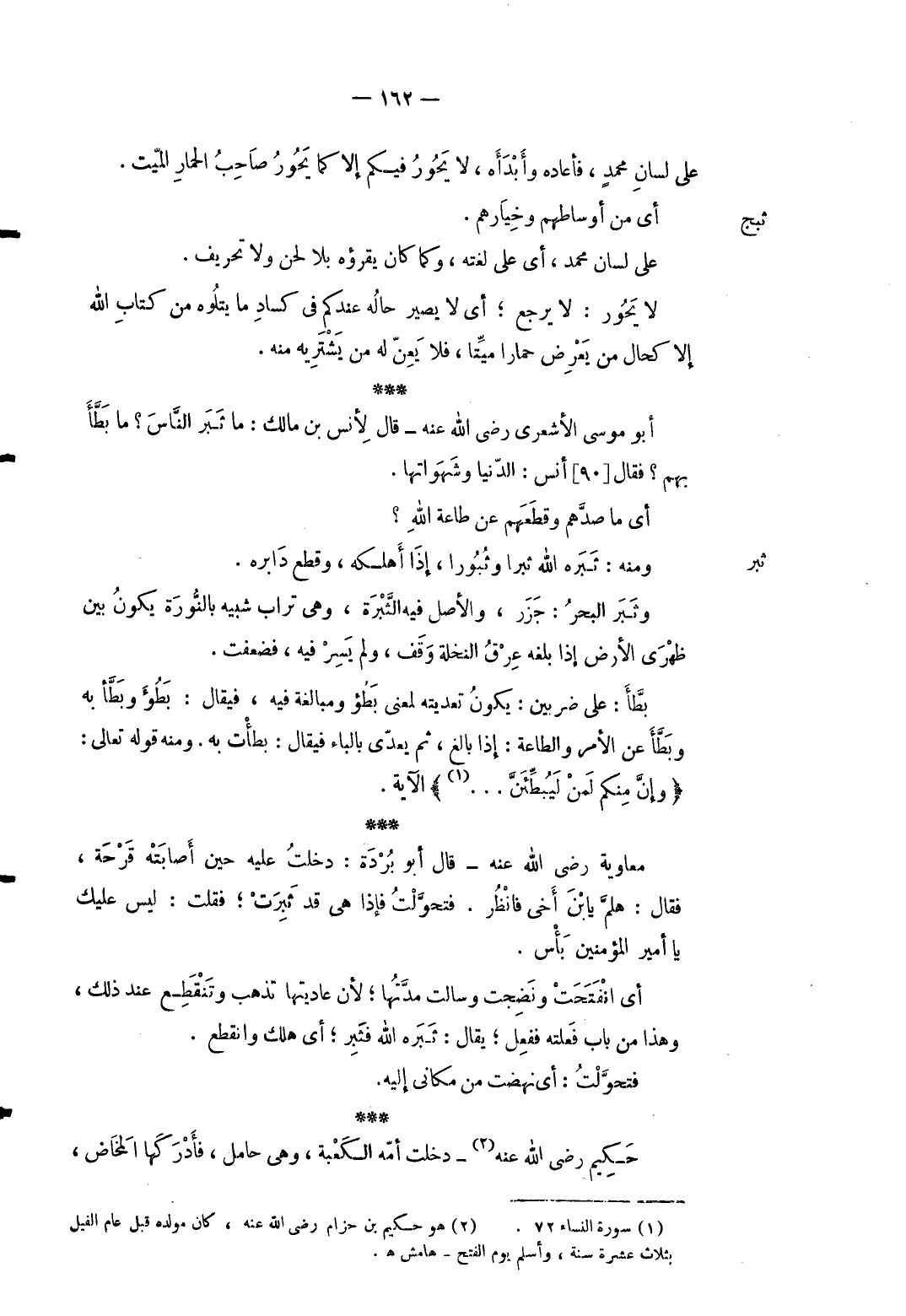 على لِسَان مُحَمَّد فَأَعَادَهُ وأبدأه لايحور فِيكُم إِلَّا كَمَا يحور صَاحب الْحمار الْمَيِّت. ثبج من أوساطهم وخيارهم. على لِسَان مُحَمَّد أَي على لغته وكما كَانَ يَقْرَؤُهُ بِلَا لحن ولاتحريف. لايحور: لايرجع أَي لايصير حَاله عنْدكُمْ فِي كساد مَا يتلوه من كتاب الله إِلَّا كَحال من يعرض حمارا مَيتا فَلَا يعن لَهُ من يَشْتَرِيهِ مِنْهُ. أَبُو مُوسَى الْأَشْعَرِيّ رَضِي الله عَنهُ قَالَ لأنس بن مَالك: مَا ثبر النَّاس مَا بطأ بهم فَقَالَ [9] أنس: الدُّنْيَا وشهواتها. أَي ماصدهم وقطعهم عَن طَاعَة الله وَمِنْه: ثبره الله ثبرا وثبورا إِذا أهلكه وَقطع دابره. د ثبر وثبر الْبَحْر: جزر وَالْأَصْل فِيهِ الثبرة وَهِي تُرَاب شَبيه بالنورة يكون بَين ظَهْري الأَرْض إذلا بلغه عرق النَّخْلَة وقف وَلم يسر فِيهِ فضعفت بطأ: على ضَرْبَيْنِ: يكون تعديته لِمَعْنى بطؤ ومبالغة فِيهِ فَيُقَال: بطؤ وبطأ بِهِ وبطأ عَن الْأَمر وَالطَّاعَة: إِذا بَالغ ثمَّ يعدى بِالْبَاء فَيُقَال: بطأت بِهِ وَمِنْه قَوْله تَعَالَى: (وإنَّ مِنكم لَمنْ لَيُبطِّئَنَّ) الْآيَة مُعَاوِيَة رَضِي الله عَنهُ قَالَ أَبُو بردة: دخلت عَلَيْهِ حِين أَصَابَته قرحَة فَقَالَ: هَلُمَّ يَابْنَ أخي فَانْظُر. فتحولت فَإِذا هِيَ قد ثبرت فَقلت: لَيْسَ عَلَيْك ياأمير الْمُؤمنِينَ بَأْس. أَي انفتحت ونضجت وسالت مدَّتهَا لِأَن عاديتها تذْهب وتنقطع عِنْد ذَلِك وَهَذَا من بَاب فعلته فَفعل يُقَال: ثبره الله مثبر أَي هلك وَانْقطع. فتحوَّلت: أَي نهضت من مَكَاني إِلَيْهِ. حَكِيم رَضِي الله عَنهُ دخلت أمه الْكَعْبَة وَهِي حَامِل فأدركها الْمَخَاض