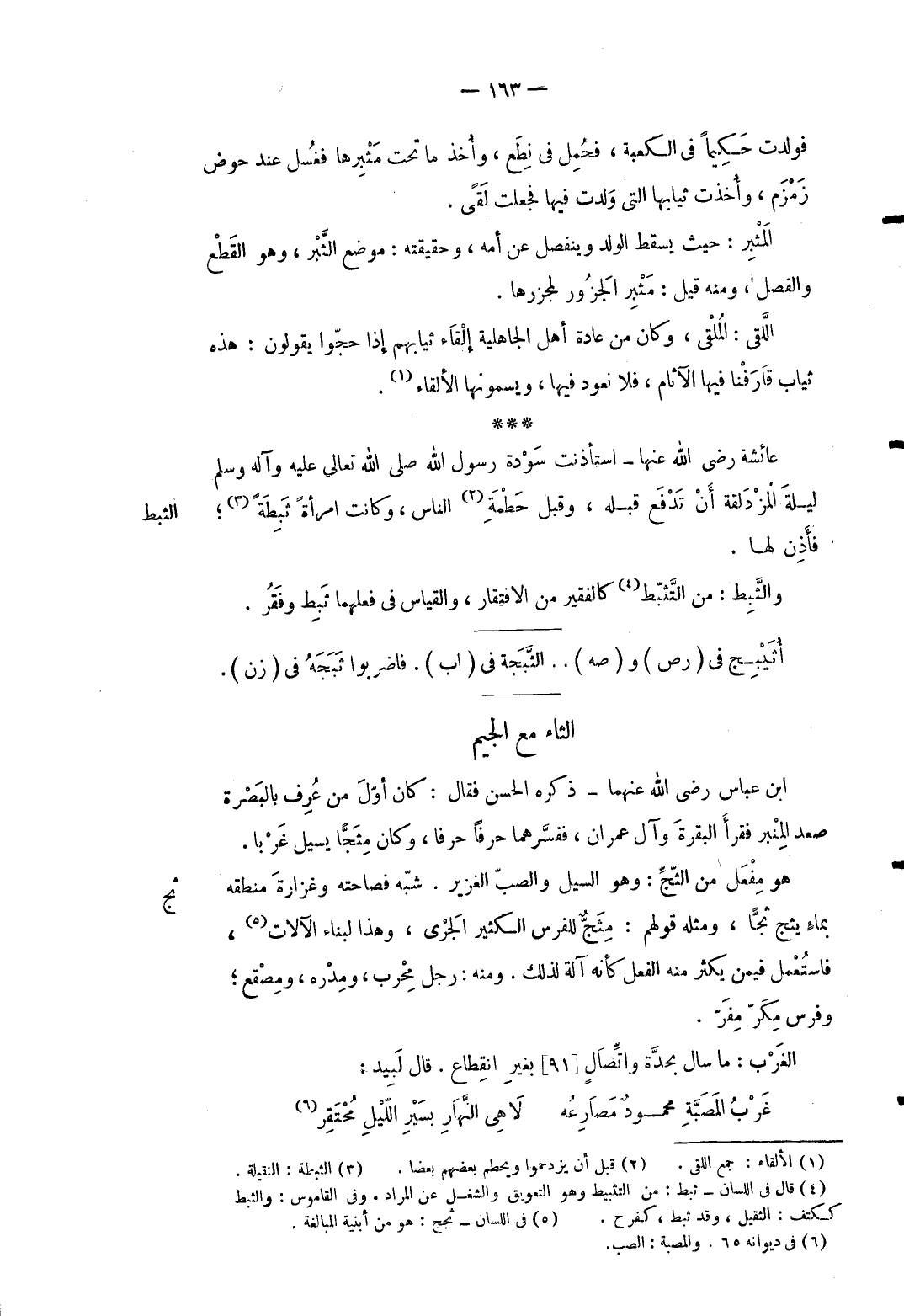 فَولدت حكيماً فِي الْكَعْبَة فحُمل فِي نطع وَأخذ ماتحت مثبرها فغُسل عِنْد حَوْض زَمْزَم وأُخذت ثِيَابهَا الَّتِي ولدت فِيهَا فَجعلت لَقِي. المثبر: حَيْثُ يسْقط الْوَلَد وينفصل عَن أمه وَحَقِيقَته: مَوضِع الثبر وَهُوَ الْقطع والفصل وَمِنْه قيل: مثبر الْجَزُور لمجزرها. اللقي: الملقي وَكَانَ من عَادَة أَهله الْجَاهِلِيَّة إِلْقَاء ثِيَابهمْ إِذا حجُّوا يَقُولُونَ: هَذِه ثِيَاب قارفنا فِيهَا الآثام ن فَلَا نعود فِيهَا ويسمونها الألقاء. عَائِشَة رَضِي الله عَنْهَا اسْتَأْذَنت سَوْدَة رَسُول الله صلى الله تَعَالَى عَلَيْهِ وَآله وَسلم لَيْلَة الْمزْدَلِفَة أَن تدفع قبله وَقبل حطمة النَّاس وَكَانَت أمْرَأَة ثبطة الثبط فَأذن لَهَا. والثبط: التثبط كالفقير من الافتقار وَالْقِيَاس فِي فعلهمَا ثبط وفقر. أُثيبج فِي (رص) و (صه) . الثبجة فِي (اب) . فاضربوا ثبجة فِي (زن) .
