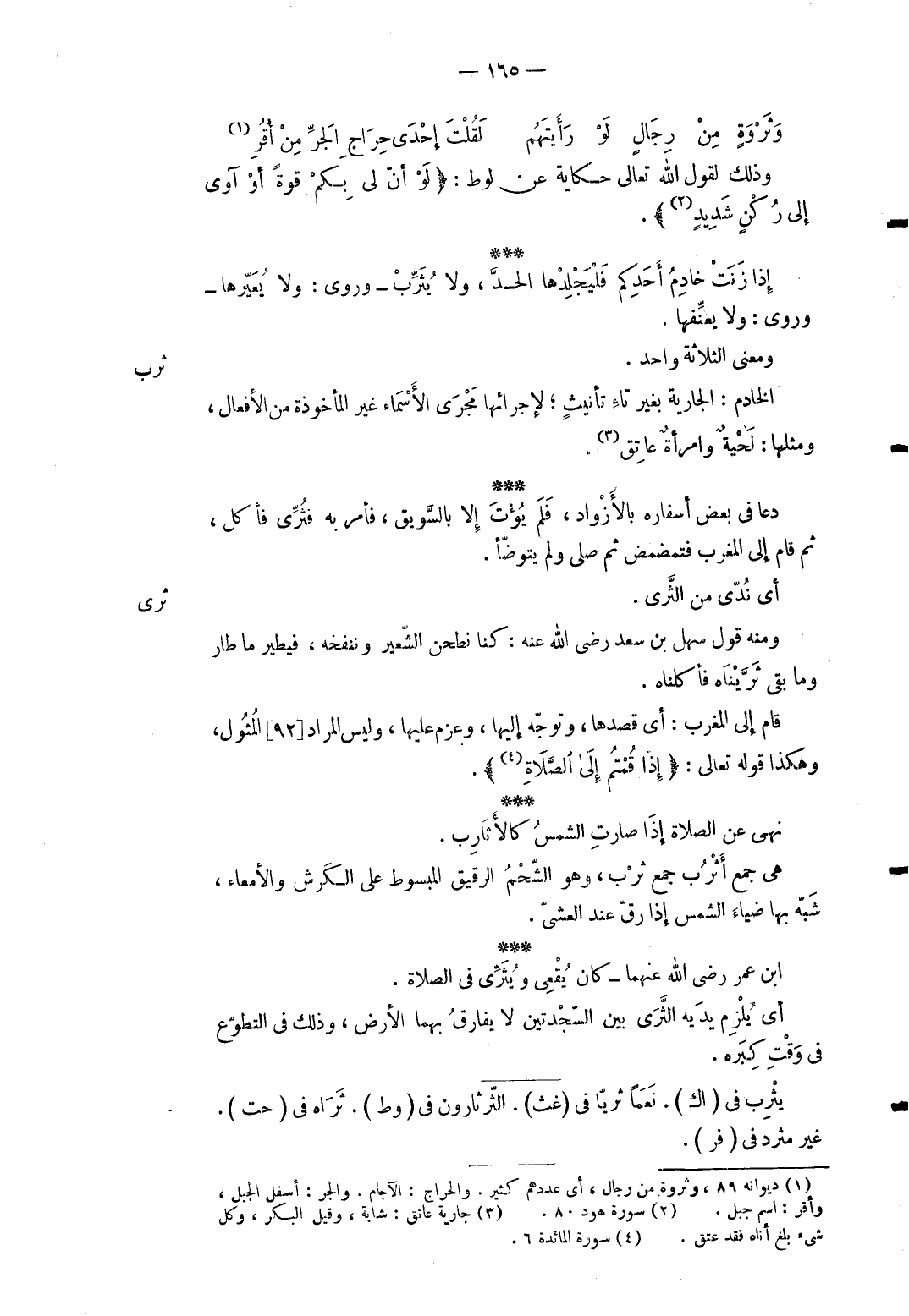 .. وَثَرْوَةٍ مِنْ رِجَالٍ لَوْ رَأَيتَهُم ... لَقُلْتَ إحْدَى حِرَاجِ الجَرِّ مِنْ أٌقُرِ ... وَذَلِكَ لقَوْل الله تَعَالَى حِكَايَة عَن لوط: (لَوْ أنّ لي بِكمْ قُوَّة أوْ آوي إِلَى رُكْنٍ شَدِيدٍ) إِذا زنت خَادِم أحدكُم فليجلدها الْحَد وَلَا يثرب وروى: ولايعيرها وروى: ولايعنفها. وَمعنى الثَّلَاثَة وَاحِدَة. الْخَادِم: الْجَارِيَة بِغَيْر تَاء تَأْنِيث لإجرائها مجْرى الْأَسْمَاء غير الْمَأْخُوذَة من الْأَفْعَال وَمثلهَا: لحية وَامْرَأَة عاتق دَعَا فِي بعض أَسْفَاره بالأزواد فَلم يُؤْت إِلَّا بالسويق فَأمر بِهِ فثرى فاكل ثمَّ قَامَ إِلَى الْمغرب فَتَمَضْمَض ثمَّ صلى وَلم يتَوَضَّأ. أَي ندى من الثرى. ثرى وَمِنْه قَول سهل بن سعد رَضِي الله عَنهُ: كُنَّا نطحن الشّعير وننفخه فيطير ماطار وبقى ثريناه فاكلناه. قَامَ إِلَى الْمغرب أَي قَصدهَا وَتوجه إِلَيْهَا وعزم عَلَيْهَا وَلَيْسَ المُرَاد [92] المثول وَهَكَذَا قَوْله تَعَالَى: (إذَا قُمْتُم إِلَى الصَّلاَةِ) . نهى عَن الصَّلَاة إِذا صَارَت الشَّمْس كالأثارب. فِي جمع أثرب جمع ثرب وَهُوَ الشَّحْم الرَّقِيق الْمَبْسُوط على الكرش والأمعاء شبه بهَا ضِيَاء الشَّمْس إِذا رق عِنْد الْعشي. ابْن عمر رَضِي الله عَنْهُمَا كَانَ يقعى ويثرى فِي الصَّلَاة. أَي يلْزم يَدَيْهِ الثرى بَين السَّجْدَتَيْنِ لايفارق بهما الأَرْض وَذَلِكَ فِي التَّطَوُّع فِي وَقت كبره. يثرب فِي (اك) . نعما ثريا فِي (غث) . الثرثا رون فِي (وط) . ثراه فِي (حت) . غير مثرد فِي (فر) .