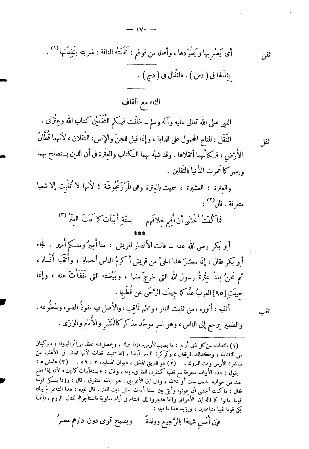 ثقل الثّقل: الْمَتَاع الْمَحْمُول على الدَّابَّة وَإِنَّمَا قيل للجن وَالْإِنْس: الثَّقَلَان لِأَنَّهُمَا قطَّان الأَرْض فكأنهما أثقلاها. وَقد شبه بهما الْكتاب والعترة فِي أَن الدّين يستصلح بهما ويعمر كَمَا عمرت الدُّنْيَا بالثقلين. والعترة: الْعَشِيرَة سميت بالعترة وَهِي المرزنجوشة لِأَنَّهَا لاتنبت إِلَّا شعبًا مُتَفَرِّقَة. قَالَ ... فَمَا كُنْتُ أَخْشَى أَن أُُِقيم خِلافَهم ... بستّةِ أَبْيَات كَمَا نَبَتَ العِتْرُ ... أَبُو بكر رَضِي الله عَنهُ قَالَت الْأَنْصَار لقريش: منا أَمِير ومنكم أَمِير. فجَاء أَبُو بكر فَقَالَ: إِنَّا معشر هَذَا الْحَيّ من قُرَيْش أكْرم النَّاس أحسابا وأثقبه أنسابا ثمَّ نَحن بعد عترة رَسُول الله الَّتِي خرج مِنْهَا وبيضته الَّتِي تفقأت عَنهُ وَإِنَّمَا جيبت [95] الْعَرَب عَنَّا كَمَا جيبت الرَّحَى عَن قطبها.