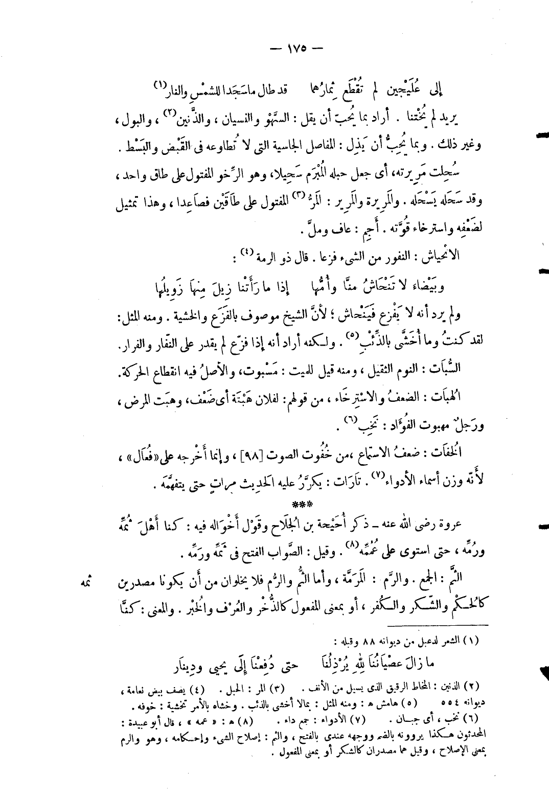 .. إِلَى عُلَيْجين لم تُقْطَع ثِمارُهما قد طَال ماسجدا للشمْسِ وَالنَّار ... يُرِيد لم يختنا. أَرَادَ بِمَا يحب أَن يقل: السَّهْو وَالنِّسْيَان والذنين وَالْبَوْل وَغير ذَلِك. وَبِمَا يحب أَن يذل: المفاصل الجاسية الَّتِي لاتطاوعه فِي الْقَبْض والبسط سحلت مريرة أَي جعل حبله المبرم سحيلا وَهُوَ الرخو المفتول على طاق وَاحِد وَقد سحله يسحله. والمريرة والمرير: المرُّ المفتول على طاقين فَصَاعِدا وَهَذَا تَمْثِيل لضَعْفه واسترخاء قوته. أجم: عَارِف وملَّ. الانحياش: النفور من الشَّيْء فَزعًا. قَالَ ذُو الرمة: ... وبيضاء لاتنحاش منا وَأمّهَا ... إِذا مارأتنا زيل مِنْهَا زويلها ... وَلم يرد أَنه لايفزع فينحاش لِأَن السيخ مَوْصُوف الْفَزع والخشية وَمِنْه الْمثل: لقد كنت وَمَا أُخشي بالذئب. وَلكنه أَرَادَ أَنه إِذا فزّع لم يقدر على النفار والفرار. السبات: النّوم الثقيل وَمِنْه قيل للْمَيت: مسبوت وَالْأَصْل فِيهِ انْقِطَاع الْحَرَكَة الهبات: الضعْف والاسترخاء من قَوْلهم: لفُلَان هِبته أَي ضعف وهبت الْمَرَض وَرجل مهبوت الْفُؤَاد: نخب. الخفات: ضغف الِاسْتِمَاع من خفوت الصَّوْت [98] وَإِنَّمَا أخرجه على فعال لِأَنَّهُ وزن أَسمَاء الأدواء. تارات: يُكَرر عَلَيْهِ الحَدِيث مَرَّات حَتَّى يتفهمه. عُرْوَة رَضِي الله عَنهُ ذكر أُحيحة بن الجلاح وَقَول أَخْوَاله فِيهِ: كُنَّا أهل ثمه ورمه حَتَّى اسْتَوَى على عممه. وَقيل الصَّوَاب الْفَتْح فِي ثمَّة ورقة. الثم: الْجمع. والرم: المرمة وَأما الثم والرم فَلَا يخلوان من أَن يَكُونَا مصدرين