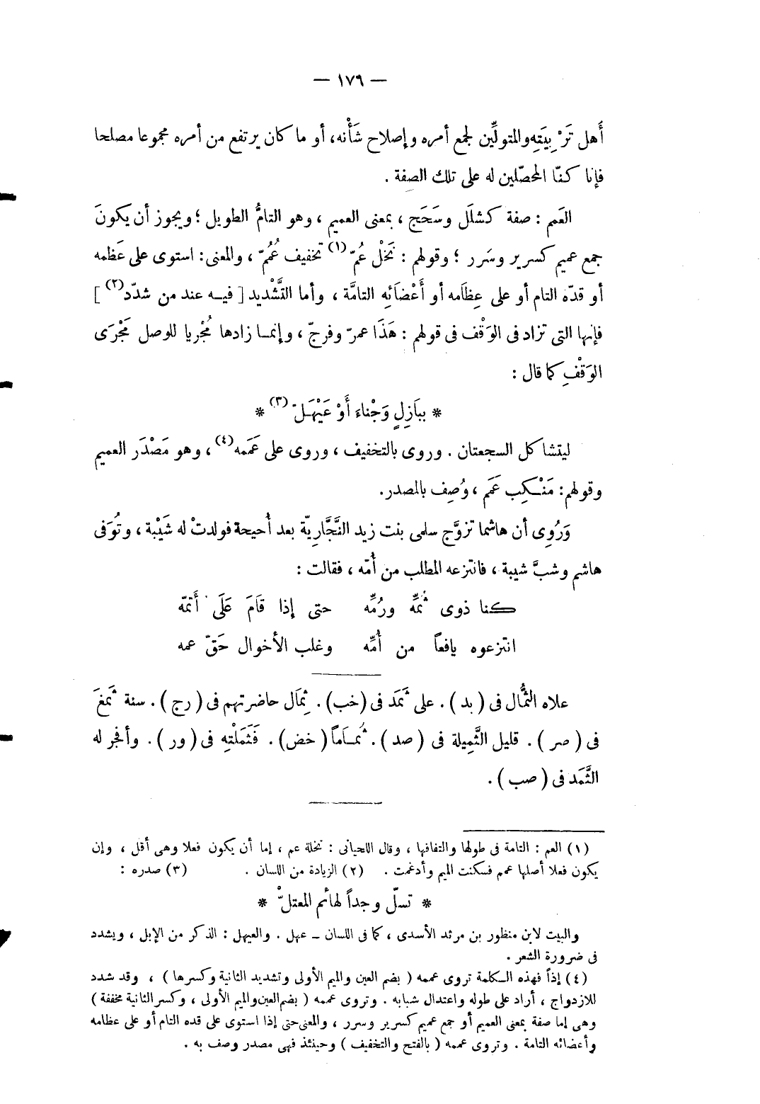 أهل تَرْبِيَته والمتولين لحمع أمره وَإِصْلَاح شَأْنه أَو ماكان يرْتَفع من أمره مجموعا مصلحا فَإنَّا كُنَّا المحصلين لَهُ على تِلْكَ الصّفة. العمم: صفة كشلل وسحج بِمَعْنى العميم وَهُوَ التَّام الطَّوِيل وَيجوز أَن يكون جمع عميم كسرير وسرر وَقَوْلهمْ: نخل عُمّ تَخْفيف عمم وَالْمعْنَى: اسْتَوَى على عظمه أَو قدّه التَّام أَو على عِظَامه أَو أَعْضَائِهِ التَّامَّة وَأما التَّشْدِيد [فِيهِ عِنْد من شدد] فَإِنَّهَا الَّتِي تزاد فِي الْوَقْف فِي قَوْلهم: هَذَا عمرا وَفرج وَإِنَّمَا زَادهَا مجريا للوصل مجْرى الْوَقْف كَمَا قَالَ: ببازل وجناء أَو عيهل ... ليتشا كل السجعتان. وروى بِالتَّخْفِيفِ وروى على عممه وَهُوَ مصدر العميم وَقَوْلهمْ: منْكب عمم وصف بِالْمَصْدَرِ. وروى أَن هاشما تزوج سلمى بنت زيد النجارية بعد أُحيحة فَولدت لَهُ شيبَة وَتُوفِّي هَاشم وشبَّ شيبَة فانتزعه الْمطلب من أمه فَقَالَت: ... كُنَّا ذَوي ثمَّة ورمة ... حَتَّى إذال قَامَ عَلَى أَتمّه