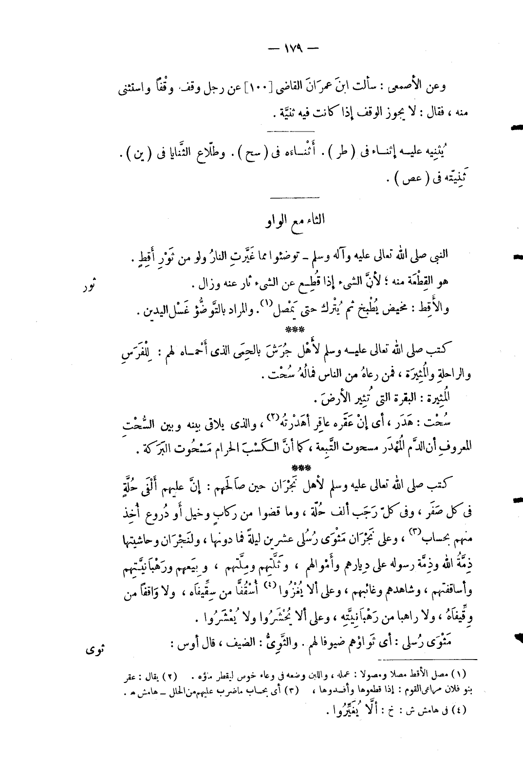 النبث صلى الله تَعَالَى عَلَيْهِ وَآله وَسلم توضئوا مِمَّا غيَّرت النَّار وَلَو من ثَوْر أقط. هُوَ الْقطعَة مِنْهُ لِأَن الشَّيْء إِذا قُطع عَن الشَّيْء ثار عَنهُ وَزَالَ ثَوْر والأقط: مخيض يُطبخ ثمَّ يتْرك حَتَّى يمصل. وَالْمرَاد بالتوضؤ غسل الْيَدَيْنِ كتب صلى الله تَعَالَى عَلَيْهِ وَسلم لأهل جُرش بالحمى الَّذِي أحماه لَهُم: للْفرس وَالرَّاحِلَة والمثيرة فَمن رعاه من النَّاس فَمَاله سحت. المثيرة: الْبَقَرَة الَّتِي تثير الأَرْض. سحت: هدر أَي إِن عقره عَاقِر أَهْدَرْتُهُ وَالَّذِي يلاقي بَينه وَبَين السُّحت الْمَعْرُوف أَن الدَّم المهدر مسحوت التبعة كَمَا أَن الْكسْب الْحَرَام مسحوت الْبركَة. كتب صلى الله تَعَالَى عَلَيْهِ وَسلم لأهل نَجْرَان حِين صَالحهمْ: إِن عَلَيْهِم ألفي حلَّة فِي كل صفر وَفِي كل رَجَب ألف حلَّة وَمَا قضوا من ركاب وخيل أَو دروع أُخذ مِنْهُم بِحِسَاب وعَلى نَجْرَان مثوى رُسُلِي عشْرين لَيْلَة فمادونها ولنجران وحاشيتها ذمَّة الله وَذمَّة رَسُوله على دِيَارهمْ وَأَمْوَالهمْ وثلتهم وملتهم وبيعهم ورهبانيتهم واساقفهم وشاهدهم وغائبهم وعَلى أَلا يغزوا أُسقفاًّ من سقيفاه وَلَا وافقا من وقيفاه ولاراهبا من رهبانيته وعَلى الا يحْشرُوا ولايعشروا. مثوى رُسُلِي: أَي ثواؤهم ضيوفا لَهُم. والثوى: الضَّيْف قَالَ أَوْس: ثوى