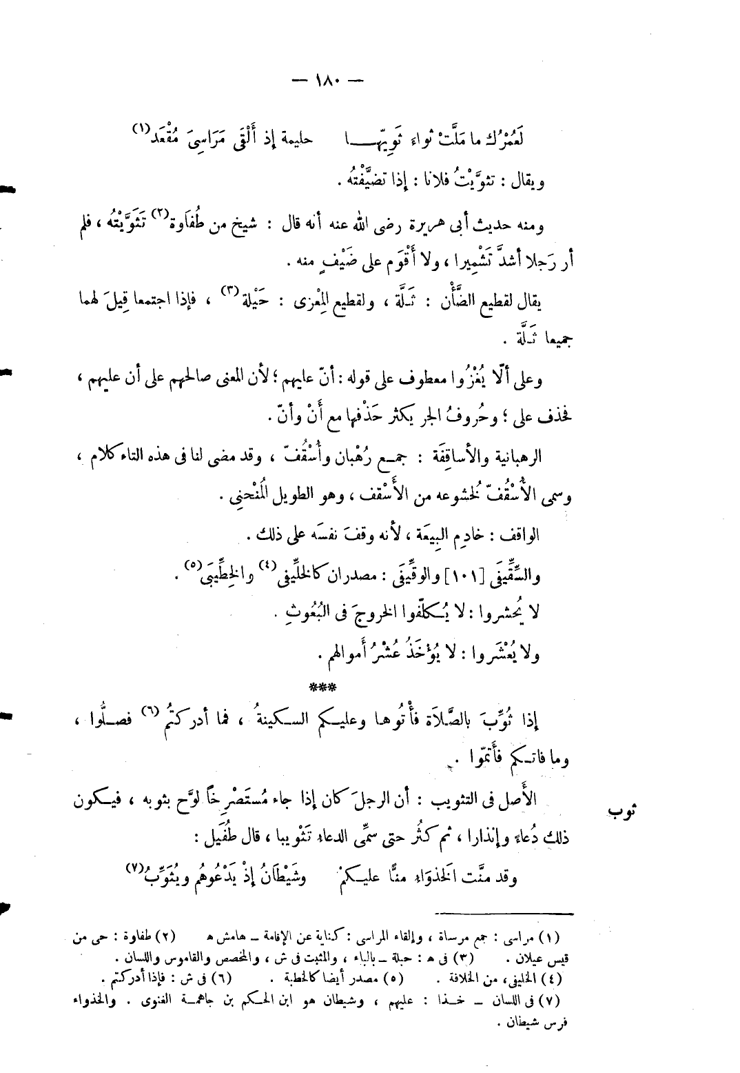 لعمرك ماملت ثواء ثويها ... حليمة إِذا أَلْقَى مَرَاسِيَ مُقْعَد ... وَيُقَال: تثَّويت فلَانا: إِذا تضَّيفته. وَمِنْه حَدِيث أبي هُرَيْرَة رَضِي الله عَنهُ أَنه قَالَ: شيخ من طفاوة تثوَّيته فَلم أر رجلا أَشد تشميرا وَلَا أقوم على ضيف مِنْهُ. يُقَال لقطيع الضَّأْن: ثلة ولقطيع المعزى: حِيلَة فَإِذا اجْتمعَا قيل لَهما جَمِيعًا ثلَّة. وعَلى أَلا يغزوا مَعْطُوف على قَوْله: أَن عَلَيْهِم لِأَن الْمَعْنى صَالحهمْ على أَن عَلَيْهِم فَحذف على وحروف الْجَرّ يكثر حذفهَا مَعَ أنْ وأنّ. الرهبانية والأساقفة: جمع رُهْبَان وأُسقف وَقد مضى لنا فِي هَذِه التَّاء كَلَام وَسمي الأُسقف لخشوعه من الأسقف وَهُوَ الطَّوِيل المنحني. الْوَاقِف: خَادِم الْبيعَة لِأَنَّهُ وقف نَفسه على ذَلِك. السقيفي [1 1] والواقيفى: مصدران الخليفي والخطيبي. لايحشروا: لايكلفوا الْخُرُوج فِي الْبعُوث. ويعشروا: لايؤخذ عشر أَمْوَالهم. إِذا ثُوِّبَ بِالصَّلَاةِ فأتوها وَعَلَيْكُم السكينَة فَمَا أدركتم فصلوا ومافاتكم فَأتمُّوا.
