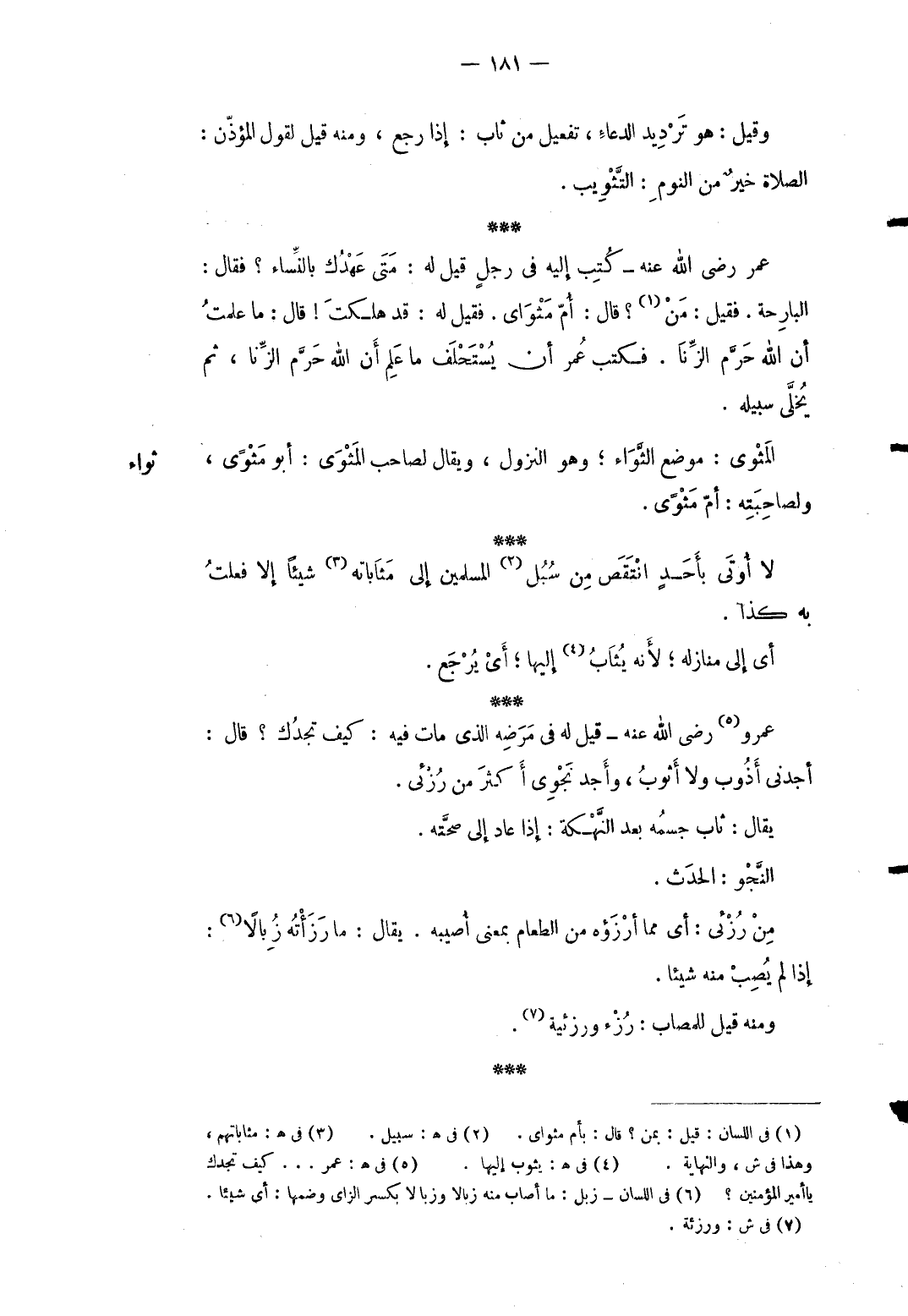 ثواء ولصاحبته: أم مثوى. لاأوتي بِأحد انْتقصَ من سبل الْمُسلمين إِلَى مثاباته شَيْئا إِلَّا فعلت بِهِ كَذَا. أَي إِلَى مَنَازِله لِأَنَّهُ يُثَاب إِلَيْهَا أَي يرجع بِهِ. عَمْرو رَضِي الله عَنهُ قيل لَهُ فِي مَرضه الَّذِي مَاتَ فِيهِ: كَيفَ تجدك قَالَ: أجدني أذوب وَلَا أثوب وأجدنجوى أَكثر من رزئي. يُقَال ثاب جِسْمه بعد النهكة: إِذا عَاد إِلَى صِحَّته. النجو: الْحَدث. من رزئي: أَي مِمَّا أرزؤه من الطَّعَام بِمَعْنى أصيبه. يُقَال: مارزأته زبالا: إِذا لم يصب مِنْهُ شَيْئا. وَمِنْه قيل للمصاب: رزء ورزئيه.