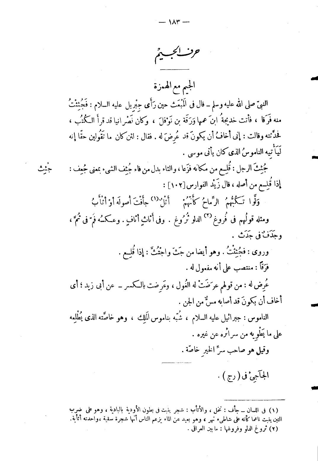 جئث إِذا قلع من أَصله قَالَ زيد الفوارس [1 2] : ... ولوا تكبتهم الرِّماحُ كأَنّهُمْ أَثْلٌ جأَفْتَ أُصولَه أوْ أثأَبُ ... وَمثله قَوْلهم فِي فروغ الدَّلْو ثروع. وَفِي أثاث أثاف. وَعَكسه فمّ فِي ثُمَّ وجدف فِي جدث. وروى فجثثت وَهُوَ أَيْضا من جث واجتث: إِذا قلع. فرقا: منتصب على أَنه مفعول لَهُ. عرض لَهُ: من قَوْلهم عرضت لَهُ الغول وَعرضت بِالْكَسْرِ عَن أبي زيد أَي أَخَاف أَن يكون قد أَصَابَهُ مس من الْجِنّ. الناموس: جِبْرَائِيل عَلَيْهِ السَّلَام شبه بناموس الْملك وَهُوَ خاصته الَّذِي يطلعه على مايطويه من سرائره من غَيره. وَقيل هُوَ صَاحب سر الْخَيْر خَاصَّة. الجاجيء فِي (رج) .
