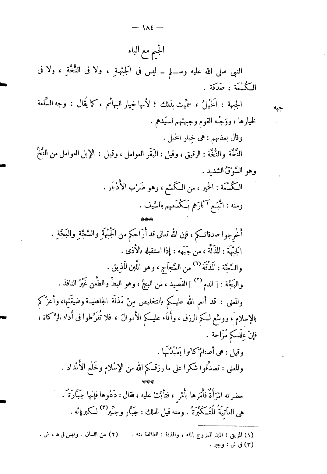 جبه الْجَبْهَة: الْخَيل سميت بذلك لِأَنَّهَا خِيَار الْبَهَائِم كَمَا يُقَال: وَجه السّلْعَة لخيارها وَوجه الْقَوْم وجبهتهم لسيدهم. وَقَالَ بَعضهم: هِيَ خِيَار الْخَيل. النخة والنخة: الرَّقِيق وَقيل: الْبَقر العوامل وَقيل: الْإِبِل العوامل من النخ وَهُوَ السُّوق الشَّديد. الكسعة: الْحمير من الكسع وَهُوَ ضرب الإدبار. وَمِنْه: اتبع آثَارهم يكسعهم بِالسَّيْفِ. أخرجُوا صَدقَاتكُمْ فَإِن الله تَعَالَى قد أراحكم من الْجَبْهَة والسجة والبجة الْجَبْهَة: المذلة من جبهة: إِذا استقبله بالأذى. والسجة: المذقة من السجاج وَهُوَ اللَّبن المذيق. والبجة [الدَّم] الفصيد من البج وَهُوَ البط والطعن غير النَّافِذ وَالْمعْنَى: قد أنعم الله عَلَيْكُم بالتخليص من مذلة الْجَاهِلِيَّة وضيقتها وأعزكم بلإسلام ووسع لكم الرزق وأفاء عَلَيْكُم الْأَمْوَال فَلَا تفرطوا فِي أَدَاء الزَّكَاة فَإِن عللكم مزاحة. وَقيل: هِيَ أصنام كَانُوا يعبدونها. وَالْمعْنَى: تصدقوا شكرا على مارزقكم الله من الْإِسْلَام وخلع الأنداد. حَضرته امْرَأَة فَأمرهَا بِأَمْر فتأبت عَلَيْهِ فَقَالَ: دَعُوهَا فَإِنَّهَا جبَّارة. هِيَ العاتية المتكبرة. وَمِنْه قيل للْملك: جَبَّار وَجبير لكبريائه.