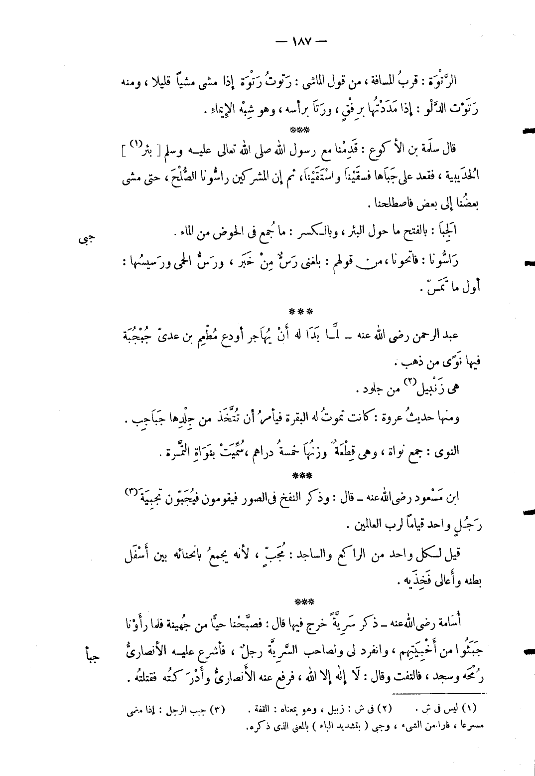 الرتوة: قرب الْمسَافَة من قَول الْمَاشِي: رتوت رتوة إِذا مَشى مشياً قَلِيلا وَمِنْه رتوت الدلوا: إِذا مددتها بِرِفْق ورتا بِرَأْسِهِ وَهُوَ شبه الْإِيمَاء. قَالَ سَلمَة بن الْأَكْوَع: قدمنَا مَعَ رَسُول الله صلى الله تَعَالَى عَلَيْهِ وَسلم [بِئْر] الْحُدَيْبِيَة فَقعدَ على جباها فسقينا وَاسْتَقَيْنَا ثمَّ أَن الْمُشْركين راسُّونا الصُّلْح حَتَّى مَشى بَعْضنَا إِلَى بعض فاصطلحنا. الجبا: بِالْفَتْح مَا حول الْبِئْر وبالكسر: مَا جُمع فِي الْحَوْض من المَاء. جبى راسونا: فاتحونا من قَوْلهم: بَلغنِي رسٌّ من خبر ورسُّ الْحمى ورسيسها: أول مَا تَمَسّ. عبد الرَّحْمَن رَضِي الله عَنهُ لما بدا لَهُ أَن يُهَاجر أودع مطعم بن عدي جبجبة فيا نوى من ذهب. هِيَ زنبيل من جُلُود. وَمِنْهَا حَدِيث عُرْوَة: كَانَت تَمُوت لَهُ الْبَقَرَة فيأمر أَن تتَّخذ من جلدهَا جباجب. النَّوَى: جمع نواة وَهِي قِطْعَة وَزنهَا خَمْسَة دَرَاهِم سميت بنواة التَّمْر ة ابْن مَسْعُود رَضِي الله عَنهُ قَالَ وَذكر النفخ فِي الصُّور فَيقومُونَ فيجبون تجبية رجل وَاجِد قيَاما لرب الْعَالمين. قيل لكل وَاحِد من الرَّاكِع والساجد: مجب لِأَنَّهُ يجمع بانحنائه بَين أَسْفَل بَطْنه وأعالي فَخذيهِ. أُسامة رَضِي الله عَنهُ ذكر سَرِيَّة خرج فِيهَا قَالَ: فصبحنا حيًّا من جُهَيْنَة فَلَمَّا رأونا جبئوا من أخبيتهم وَانْفَرَدَ لي وَلِصَاحِب السّريَّة رجل فأشرع عَلَيْهِ الْأنْصَارِيّ