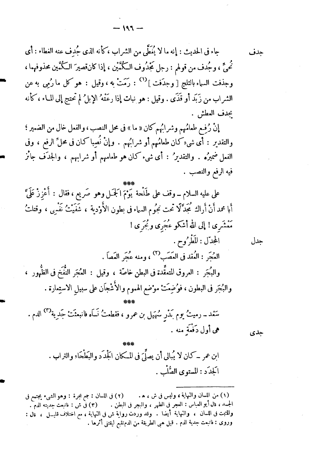 جَاءَ فِي الحَدِيث: إِنَّه مالايغطى من الشَّرَاب كَأَنَّهُ الَّذِي جُدف عَنهُ الغطاء: أَي نحى وجذف من قَوْلهم: رجل مجدوف الكمين إِذا كَانَ قصير الكمين محذوفهما وجذفت السَّمَاء بالثلج [وجدفت] : رمت بِهِ وَقيل: هُوَ كل مَا رُمي بِهِ عَن الشَّرَاب من زبد أَو قذى. وَقيل: هُوَ نَبَات إِذا رعته لإبل لم تحتج إِلَى المَاء كَأَنَّهُ بجدف الْعَطش. جدف وَالتَّقْدِير: أَي شَيْء كَانَ طعامهم أَو شرابهم. وَإِن نصبا كَانَ فِي مَحل الرّفْع وَفِي الْفِعْل ضمير هـ. وَالتَّقْدِير: أَي شَيْء كَانَ هُوَ طعامهم أَو شرابهم والجدف جَائِز فِيهِ الرّفْع وَالنّصب. عَليّ عَلَيْهِ السَّلَام وقف على طَلْحَة يَوْم الْجمل وَهُوَ صريع فَقَالَ: أعزز عليَّ أَبَا مُحَمَّد أَن أَرَاك مجلا تَحت نُجُوم السَّمَاء فِي بطُون الأودية شفيت نَفسِي وَقتلت معشري إِلَى الله أَشْكُو عجري ونجري المجدل: الْمَطْرُوح جدل العجر: العقد فِي العصب وَمِنْه عجر الْعَصَا. والبجر: الْعُرُوق المتعقدة فِي الْبَطن خَاصَّة وَقيل: العجر النفخ فِي الظُّهُور والبجر فِي الْبُطُون فَوضعت مَوضِع الهموم والأشجان على سَبِيل الِاسْتِعَارَة. سعد رميت يَوْم بدر سُهَيْل بن عَمْرو فَقطعت نساه فانبعثت جدية الدَّم. جدى هِيَ أول دفْعَة مِنْهُ. ابْن عمر كَانَ لايبالي أَن يُصَلِّي فِي الْمَكَان الجدد والبطحاء وَالتُّرَاب. الجدد: المستوي الصلب