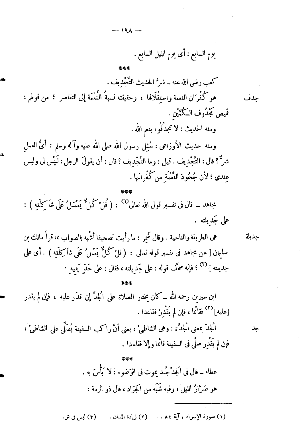 يَوْم السَّابِع: أَي يَوْم اللَّيْل السَّابِع. كَعْب رَضِي الله عَنهُ شَرّ الحَدِيث التجديف. جدف هُوَ كفران النِّعْمَة واستقلالها وَحَقِيقَته نِسْبَة النِّعْمَة إِلَى التقاصر من قَوْلهم: فميص مجدوف الكمين وَمِنْه الحَدِيث لاتجدفوا بنعم الله. وَمِنْه الحَدِيث الْأَوْزَاعِيّ: سُئل رَسُول الله صلى الله عَلَيْهِ وَسلم: أَي الْعَمَل شَرّ قَالَ: التجديف. قيل وَمَا التجديف قَالَ: أَن يَقُول الرجل: لَيْسَ لي وَلَيْسَ عِنْدِي لِأَن جحود النِّعْمَة من كفرانها. مُجَاهِد قَالَ فِي تَفْسِير قَول الله تَعَالَى: (قُلْ كُلٌّ يَعْمَلُ عَلَى شَاكِلَتِه) : على جديلته. جديلة هِيَ الطَّرِيقَة والناحية. وَقَالَ شمر: مارأيت تصحيفا أشبه بِالصَّوَابِ مِمَّا قَرَأَ مَالك بن سليما ن [عَن مُجَاهِد فِي تَفْسِير قَوْله تَعَالَى: (قُلْ كُلٌّ يَعْمَلُ عَلَى شَاكِلَتِه) . أَي على جديلته] فَإِنَّهُ صحف قَوْله ك على جديلته فَقَالَ: على حد يَلِيهِ. ابْن سِيرِين رتحنه الله كَانَ يخْتَار الصَّلَاة على الْجد إِن قدر عَلَيْهِ فَإِن لم يقدر [عَلَيْهِ] فقائما فَإِن لم يقدر فقاعدا. جد الْجد بِمَعْنى الْجدّة: وَهِي الشاطئ يَعْنِي أَن رَاكب السَّفِينَة يُصَلِّي على الشاطئ فَإِن لم يقدر صلى فِي السَّفِينَة فائما وَإِلَّا فقاعدا. عَطاء قَالَ فِي الْجد جديموت فِي الْوضُوء: لابأس بِهِ. هُوَ صرَّار اللَّيْل وَفِيه شبه من الْجَرَاد قَالَ ذُو الرمة: