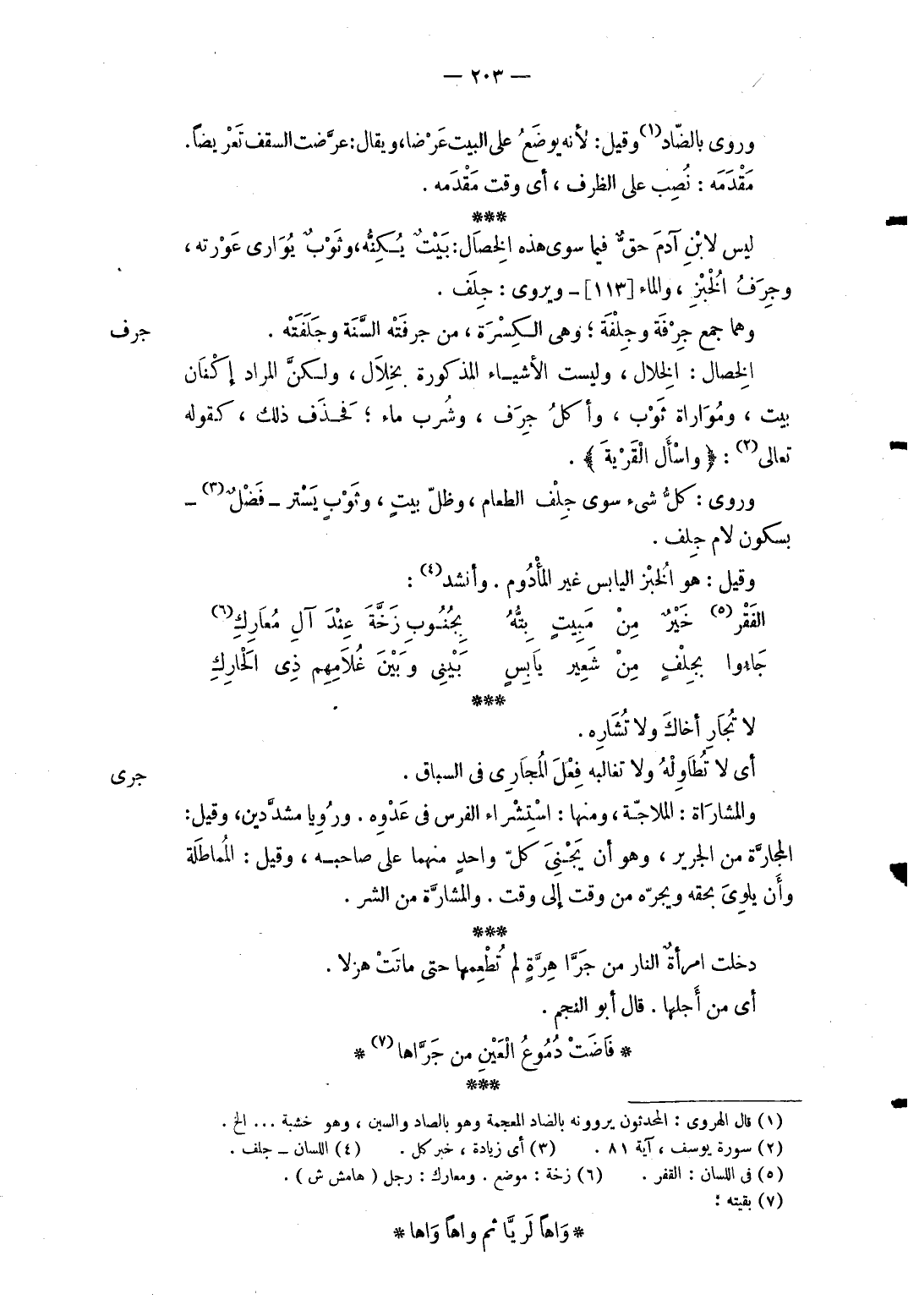 جرف وهما جمع جرفة وجلفة وَهِي الكسرة من جرفته السّنة وجلفته. الْخِصَال: الْخلال وَلَيْسَت الْأَشْيَاء الْمَذْكُورَة بخلال وَلَكِن المُرَاد إكنان بَيت ومواراة ثوب وَأكل جرف وَشرب مَاء فَحذف ذَلِك كَقَوْلِه تَعَالَى {واسْأَل الْقَرْيةَ} . وروى: كل شَيْء سوى جلف الطَّعَام وظل بَيت وثوب يستر فضل بِسُكُون لَام جلف. وَقيل: هُوَ الْخبز اليابيس غير المأدوم. وَأنْشد: ... الفَقْر خَيْرٌ مِنْ مَبِيتٍ بِتُّهُ ... بِجُنُوبِ زَخَّةَ عِنْدَ آلِ مُعَارِكِ