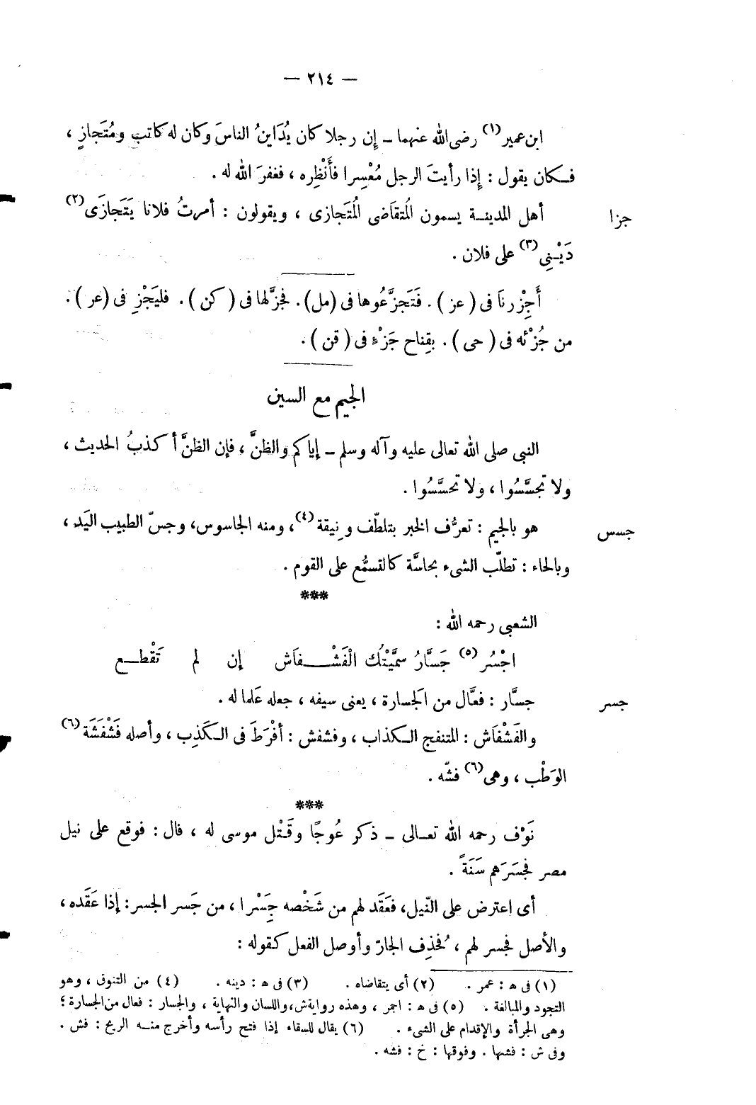 جسر جسَّار: فعَّال من الجسارة يَعْنِي سَيْفه جعله علما لَهُ. والفشفاش: المنتفج الْكذَّاب وفشفش: أفرط فِي الْكَذِب وَأَصله فشفشة الوطب وَهِي فشّه. نوف رَحمَه الله تَعَالَى: ذكر عوجا وَقتل مُوسَى لَهُ قَالَ: فَوَقع على نيل مصر فجسرهم سنة. أَي اعْترض على النّيل فعقد لَهُم من شخصه جِسْرًا من جسر الجسر: إِذا عقده وَالْأَصْل فجسر لَهُم فَحذف الْجَار وأوصل الْفِعْل كَقَوْلِه: