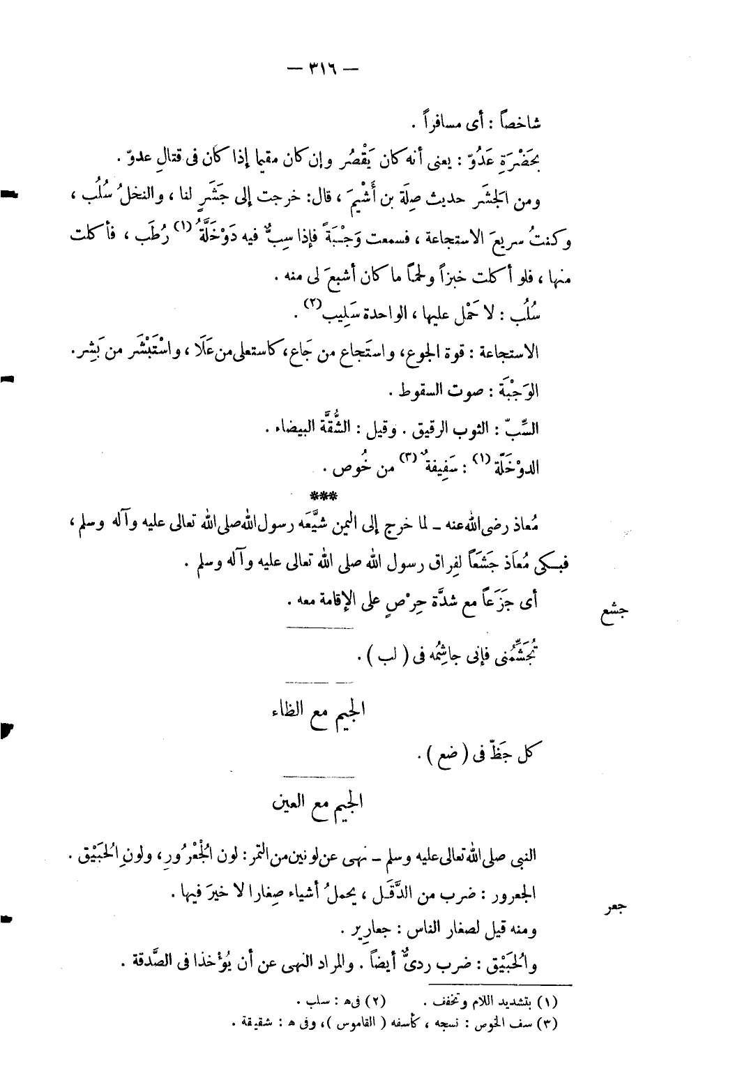 شاخصاً: أَي مُسَافِرًا. بِحَضْرَة عَدو: يَعْنِي أَنه كَانَ يقصر وَإِن كَانَ مُقيما إِذا كَانَ فِي قتال عَدو. وَمن الجشر حَدِيث صلَة بن أَشْيَم قَالَ: خرجت إِلَى جشر لنا وَالنَّخْل سلب وَكنت سريع الاستجاعة فَسمِعت وجبة فَإِذا سبّ فِيهِ دوخلة رطب فَأكلت مِنْهَا فَلَو أكلت خبرزا وَلَحْمًا مَا كَانَ أشْبع لي مِنْهُ. سلب: لَا حمل عَلَيْهَا الْوَاحِد سليب. الاستجاعة: قُوَّة الْجُوع واستجاع من جَاع كاستعلى من علا واستبشر من بشر. الوجبة: صَوت السُّقُوط. السب: الثَّوْب الرَّقِيق. وَقيل: الشقَّة الْبَيْضَاء. الدوخلة: سفيفة من خوص. معَاذ رَضِي الله عَنهُ لما خرج إِلَى الْيمن شيعه رَسُول الله صلى الله تَعَالَى عَلَيْهِ وَآله وَسلم فَبكى معَاذ جشعاً لفراق رَسُول الله صلى الله تَعَالَى عَلَيْهِ وَآله وَسلم.