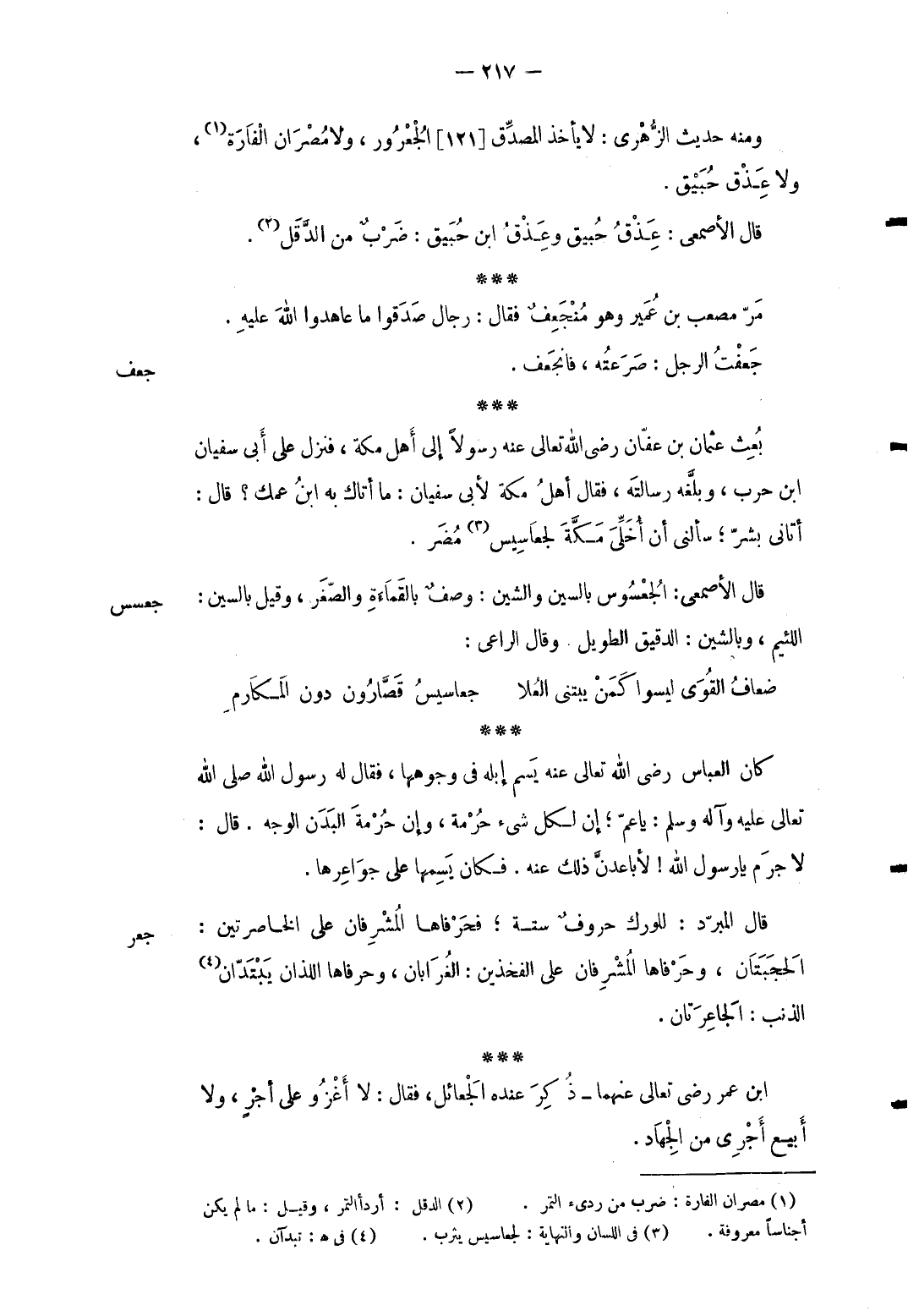 جعسس قَالَ الْأَصْمَعِي: الجعسوس بِالسِّين والشين: وصف بالقماءة والصغر وَقيل بِالسِّين: اللَّئِيم وبالشين: الدَّقِيق الطَّوِيل. وَقَالَ الرَّاعِي: ... ضعافُ القُوَى لَيْسُوا كَمَنْ يبتني العُلا ... جعاسيسُ قَصَّارُون دون المَكَارمِ ... كَانَ الْعَبَّاس رَضِي الله تَعَالَى عَنهُ يسم إبِله فِي وُجُوههم فَقَالَ لَهُ رَسُول الله صلى الله تَعَالَى عَلَيْهِ وَآله وَسلم: يَا عَم إِن لكل شَيْء حُرمة وَإِن حُرْمَة الْبدن الْوَجْه. قَالَ: لَا جرم يَا رَسُول الله لأباعدن ذَلِك عَنهُ. فَكَانَ يسمهَا على جواعرها.