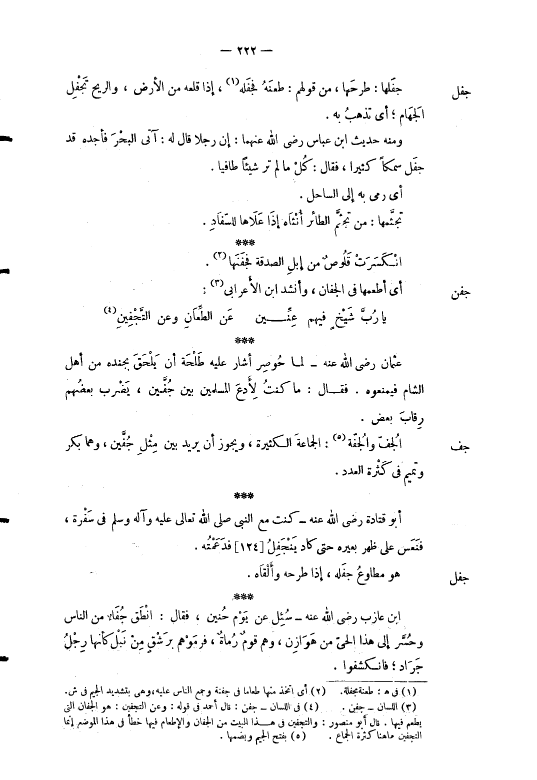 جفن أأطعمها فِي الجفان وَأنْشد ابْن الْأَعرَابِي: ... يَا رُبَّ شَيْخٍ فيهم عِنِّين ... عَن الطِّعَانِ وَعَن التَّجْفِينِ. ... عُثْمَان رَضِي الله عَنهُ لما حُوصر أَشَارَ عَلَيْهِ طَلْحَة أَن يلْحق بجنده من أهل الشَّام فيمنعوه. فَقَالَ: مَا كنت لأدع الْمُسلمين بَين جفين يضْرب بَعضهم رِقَاب بعض.