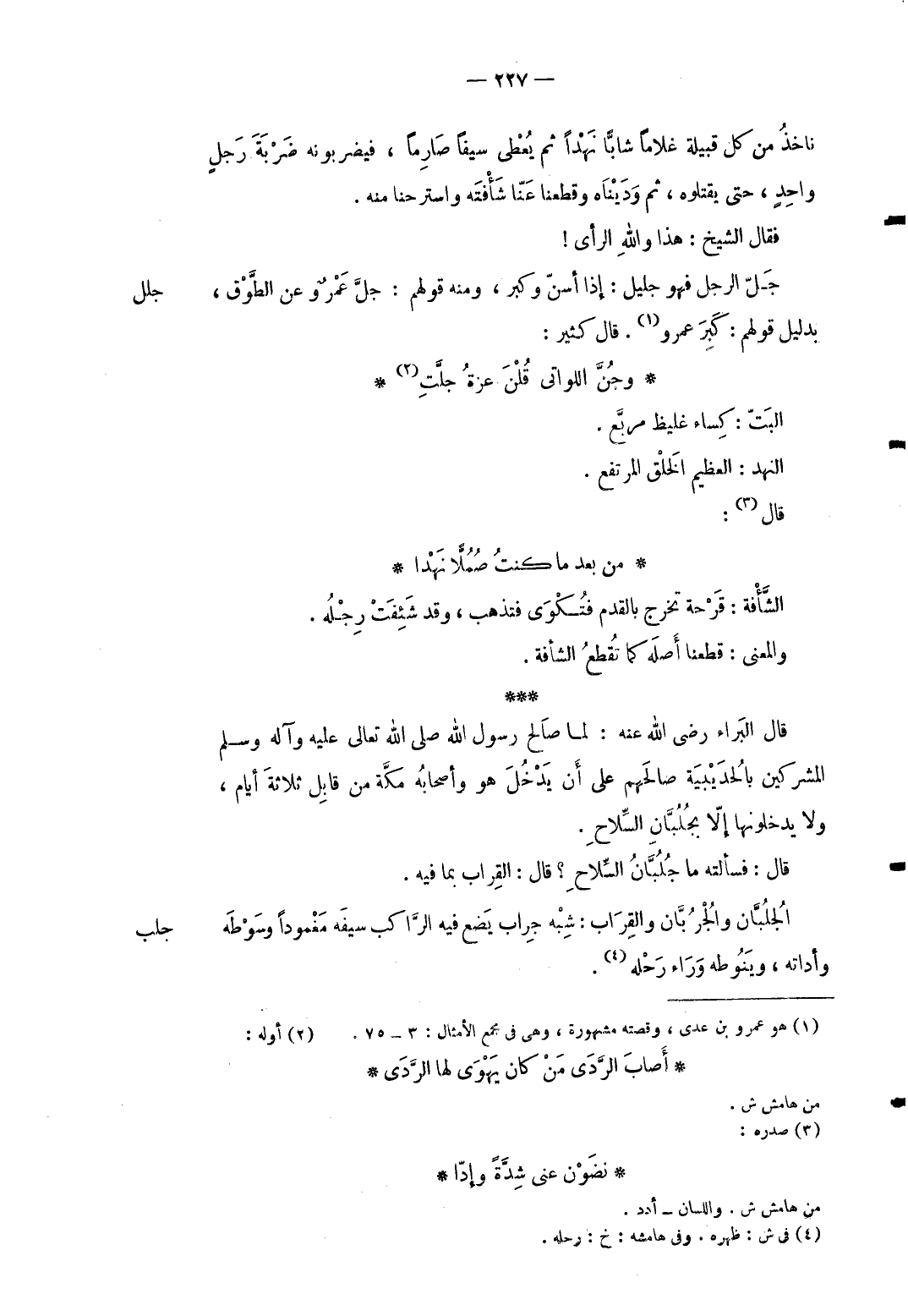 جلل جلّ الرجل فَهُوَ جليل: إِذا أسن وَكبر وَمِنْه قَوْلهم: جلَّ عَمْرو عَن الطوق بِدَلِيل قَوْلهم: كبر عَمْرو. قَالَ كثير: ... وجُنَّ اللواتي قُلْنَ عزةُ جلَّتِ ... الْبَتّ: كسَاء غليظ مربع. النهد: الْعَظِيم الْخلق الْمُرْتَفع. قَالَ: ... من بعد مَا كنتُ صُمُلاًّ نَهْدا ... الشأفة: قرحَة تخرج بالقدم فتكوى فتذهب وَقد شئفت رجله. وَالْمعْنَى: قَطعنَا أَصله كَمَا تقطع الشأفة. قَالَ الْبَراء رَضِي الله عَنهُ: لما صلح رَسُول الله صلى الله تَعَالَى عَلَيْهِ وَآله وَسلم الْمُشْركين بِالْحُدَيْبِية صَالحهمْ على أَن يدْخل هُوَ وَأَصْحَابه مَكَّة من قَابل ثَلَاثَة أَيَّام وَلَا يدْخلُونَهَا إِلَّا بجلبان السِّلَاح. قَالَ: فَسَأَلته مَا جلبان السِّلَاح. قَالَ: القراب بِمَا فِيهِ.