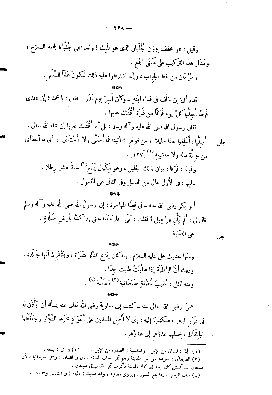 جلل أُجلها: أعلفها علفا جَلِيلًا من قَوْلهم: أَتَيْته فَمَا أجلَّني وَلَا أحشاني: أَي مَا أَعْطَانِي من جلة مَاله وَلَا حَاشِيَته. [127] وَقَوله: فرقا بَيَان لذَلِك الْجَلِيل وَهُوَ مكيال يسع سِتَّة عشر رطلا. عَلَيْهَا: فِي الأول حَال عَن الْفَاعِل وَفِي الثَّانِي عَن الْمَفْعُول. أَبُو بكر رَضِي الله عَنهُ فِي قصَّة المهاجرة: إِن رَسُول الله صلى الله عَلَيْهِ وَسلم قَالَ لي: ألم يَأن للرحيل فَقلت: بلَى فارتحلنا حَتَّى إِذا كُنَّا بِأَرْض جلدَة.
