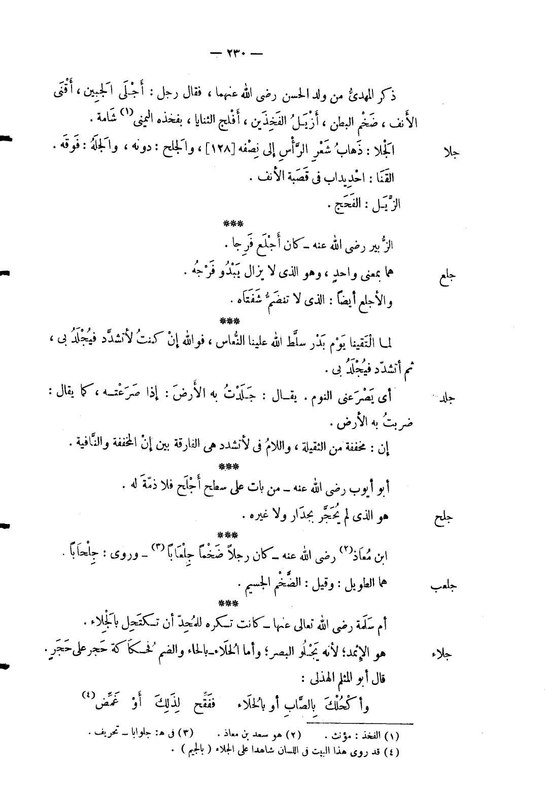 جلا الجلا: ذهَاب شعر الرَّأْس إِلَى نصفه [128] والجلح: دونه والجله: فَوْقه. القنا: احديداب فِي قَصَبَة الْأنف. الزبير رَضِي الله عَنهُ كَانَ أجلع فرجا.