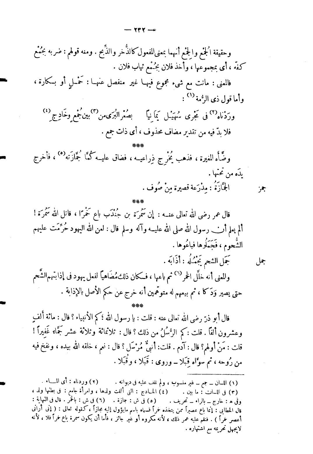 جمل جمل الشَّحْم يجمله: أذابه. وَالْمعْنَى أَنه خلل الْخمر ثمَّ بَاعهَا فَكَانَ ذَلِك مضاهياً لفعل يهود فِي إذابتهم الشَّحْم حَتَّى يصير ودكا ثمَّ بيعهم لَهُ متوهمين أَنه خرج عَن حكم الأَصْل بالإذابة. قَالَ أَبُو ذَر رَضِي الله تَعَالَى عَنهُ: قلت: يَا رَسُول الله كم الْأَنْبِيَاء قَالَ: مائَة ألف وَعِشْرُونَ ألفا. قلت: كم الرُّسُل من ذَلِك قَالَ: ثَلَاثمِائَة وَثَلَاثَة عشر جمَّاءً غفيراً قلت: من أَوَّلهمْ قَالَ: آدم. قلت: أَنَبِي مُرْسل قَالَ: نعم خلقه الله بِيَدِهِ وَنفخ فِيهِ من روحه ثمَّ سوَّاه قِبَلا. وروى قبلا وقبلا.