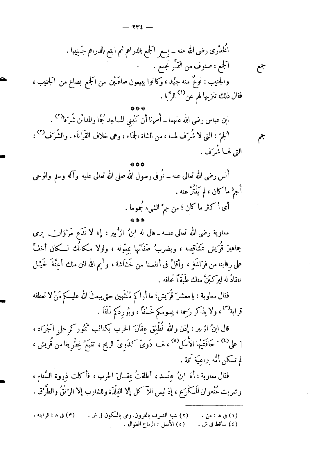جم الجم: الَّتِي لَا شُرف لَهَا من الشَّاة الْجَمَّاء وَهِي خلاف القرناء. والشرف: الَّتِي لَهَا شُرف. أنس رَضِي الله تَعَالَى عَنهُ: توفّي رَسُول الله صلى الله تَعَالَى عَلَيْهِ وَآله وَسلم وَالْوَحي أجمُّ مَا كَانَ لم يفتر عَنهُ. أَي أَكثر مَا كَانَ من جم الشىء جموما. مُعَاوِيَة رَضِي الله تعاله عَنهُ: قَالَ لَهُ ابْن الزبير: إِنَّا لَا نَدع مَرْوَان يَرْمِي جَمَاهِير قُرَيْش بمشاقصه وَيضْرب صفاتها بمعوله وَلَوْلَا مَكَانك لَكَانَ أخف على رقابنا من فراشة وَأَقل فِي أَنْفُسنَا من خشاشة وأيم الله لَئِن ملك أَعِنَّة خيل تنقاد لَهُ ليركبن مِنْك طبقًا تخافه. فَقَالَ مُعَاوِيَة: يَا معشر قُرَيْش مَا أَرَاكُم منتهين حَتَّى يبْعَث الله عَلَيْكُم من لَا تعطفه قرَابَة وَلَا يذكر رحما يسومكم خسفاً ويوردكم تلفا. قَالَ ابْن الزبير: إِذن وَالله نطلق عقال الْحَرْب بكتائب تمور كَرجل الْجَرَاد على جافتها الأسل لَهَا دوِي كَدَوِيِّ الرّيح تتبع غطريفا من قُرَيْش لم تكن أمه براعية ثلة. فَقَالَ مُعَاوِيَة: أَنا ابْن هِنْد أطلقت عقال الْحَرْب فَأكلت ذرْوَة السنام وشربت عنفوان المكرع إِذْ لَيْسَ للآكل إِلَّا الفلذة وللشارب إِلَّا الرنق والطرق.