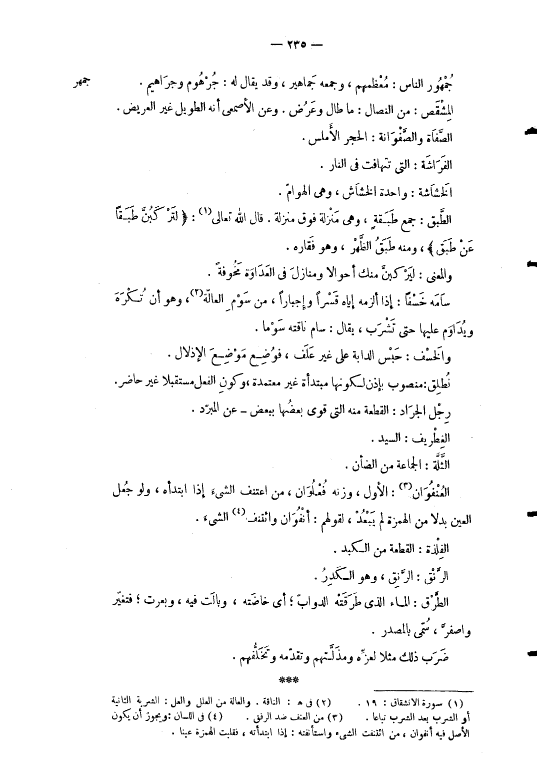 جمهر جُمْهُور النَّاس: معظمهم وَجمعه جَمَاهِير وَقد يُقَال لَهُ: جرهوم وجراهيم. المشقص: من النصال: مَا طَال وَعرض. وَعَن الْأَصْمَعِي أَنه الطَّوِيل غير العريض. الصفاة والصفوانة: الْحجر الأملس. الفراشة: الَّتِي تتهافت فِي النَّار. الخشاشة: وَاحِدَة الخشاش وَهِي الْهَوَام. الطَّبَق: جمع طبقَة وَهِي منزلَة فَوق منزلَة. قَالَ الله تَعَالَى: {لَتْركَبُنَّ طَبَقًا عَنْ طَبَق} . وَمِنْه طبق الظّهْر وَهُوَ فقاره. وَالْمعْنَى: ليركبن مِنْك أحوالا ومنازل فِي الْعَدَاوَة مخوفة. سامه خسفاً: إِذا ألزمهُ إِيَّاه قسراً وإجباراً من سوم العالة وَهُوَ أَن تكره ويداوم عَلَيْهَا حَتَّى تشرب يُقَال: سَام نَاقَته سوما. والخسف: حبس الدَّابَّة على غير علف فوُضع مَوضِع الإذلال. نطلق: مَنْصُوب يإذن لكَونهَا مبيدا غير مُعْتَمدَة وَكَون الْفِعْل مُسْتَقْبلا غير حَاضر. رجل الْجَرَاد: الْقطعَة مِنْهُ الَّتِي قوي بَعْضهَا بِبَعْض عَن الْمبرد. الغطريف: السَّيِّد. الثلَّة: الْجَمَاعَة من الضَّأْن. العنفوان: الأول وَزنه فعلوان من اعتنف الشَّيْء إِذا ابتدأه وَلَو جعل الْعين بَدَلا من الْهمزَة لم يبعد لقَولهم: أنفوان وائتنف الشَّيْء. الفلذة: الْقطعَة من الكبد. الرَّنْق: الرَّنِق وَهُوَ الكدر. الطّرق: المَاء الَّذِي طرقته الدَّوَابّ اي خاضته وبالت فِيهِ وبعرت فَتغير واصفرَّ سُمي بِالْمَصْدَرِ. ضرب ذَلِك مثلا لعزه ومذلتهم وتقدمه وتخلفهم.