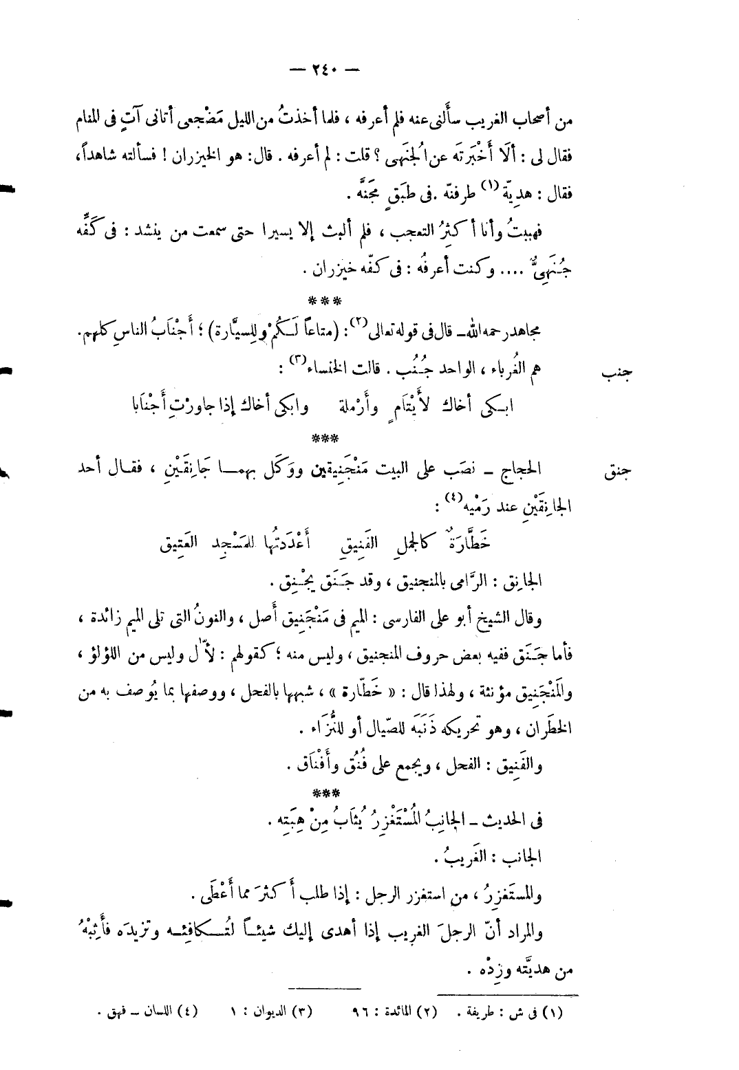 من أَصْحَاب الْغَرِيب سَأَلَني عَنهُ فَلم أعرفهُ فَلَمَّا أخذت من اللَّيْل مضجعي أَتَانِي آتٍ فِي الْمَنَام فَقَالَ لي: أَلا أخْبرته عَن الْجُهَنِيّ قلت: لم أعرفهُ. قَالَ: هُوَ الخيزران فَسَأَلته شَاهدا فَقَالَ: هَدِيَّة طرفنه. فِي طبق مجنَّه. فهببت وَأَنا أَكثر التَّعَجُّب فَلم ألبث إِلَّا يَسِيرا حَتَّى سَمِعت من ينشد: ... فِي كَفه جهنى ... ... . ... وَكنت أعرفهُ: فِي كَفه خيزران ... . مُجَاهِد رَحمَه الله قَالَ فِي قَوْله تَعَالَى: {مَتَاعا لكم وللسيارة} أجناب النَّاس كلهم.